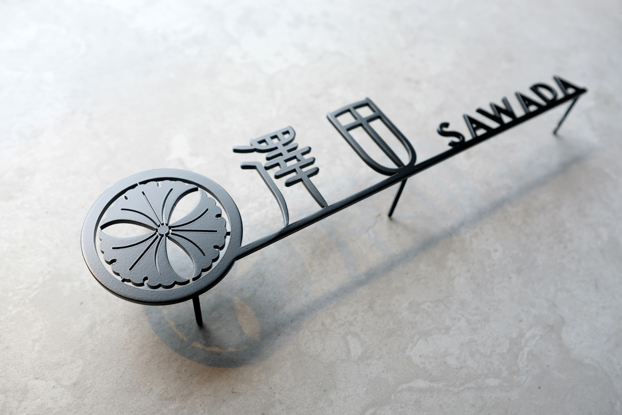 ステンレス切り文字表札 マットブラック 家紋デザイン 2019/9/12 木曜日2019/9/18 水曜日 by miyasu ステンレス切り文字表札 家紋ステンレス切り文字浮き文字ブラック塗装マットブラック焼付け塗装 家紋『中輪に三つ銀杏』のステンレス切り文字表札 門柱のイメージ図を拝見してご提案しました 幅320mm デザイン的にも美しい銀杏紋を精密な加工で仕上げました 表面はつや消しのブラックの焼付け塗装 LINE@で打ち合わせ 茨城県に送ります sawada 澤田 お問い合せ用URL : このページで紹介した作品についてのお問い合わせは、上記URLをコピーして 『お問い合せ』のぺージの記入欄に上記「お問い合せ用URL」を貼り付けてご連絡ください。 ご質問、見積依頼、ご注文についても『お問い合せ』のページからヒロノクラフト公式LINE及びメールでお願いします。 ※ご利用いただく端末によっては、コメント送信後にエラー表示されるなどのうまく反映されない場合がございます。 その場合はLINEにて、ご連絡ください。