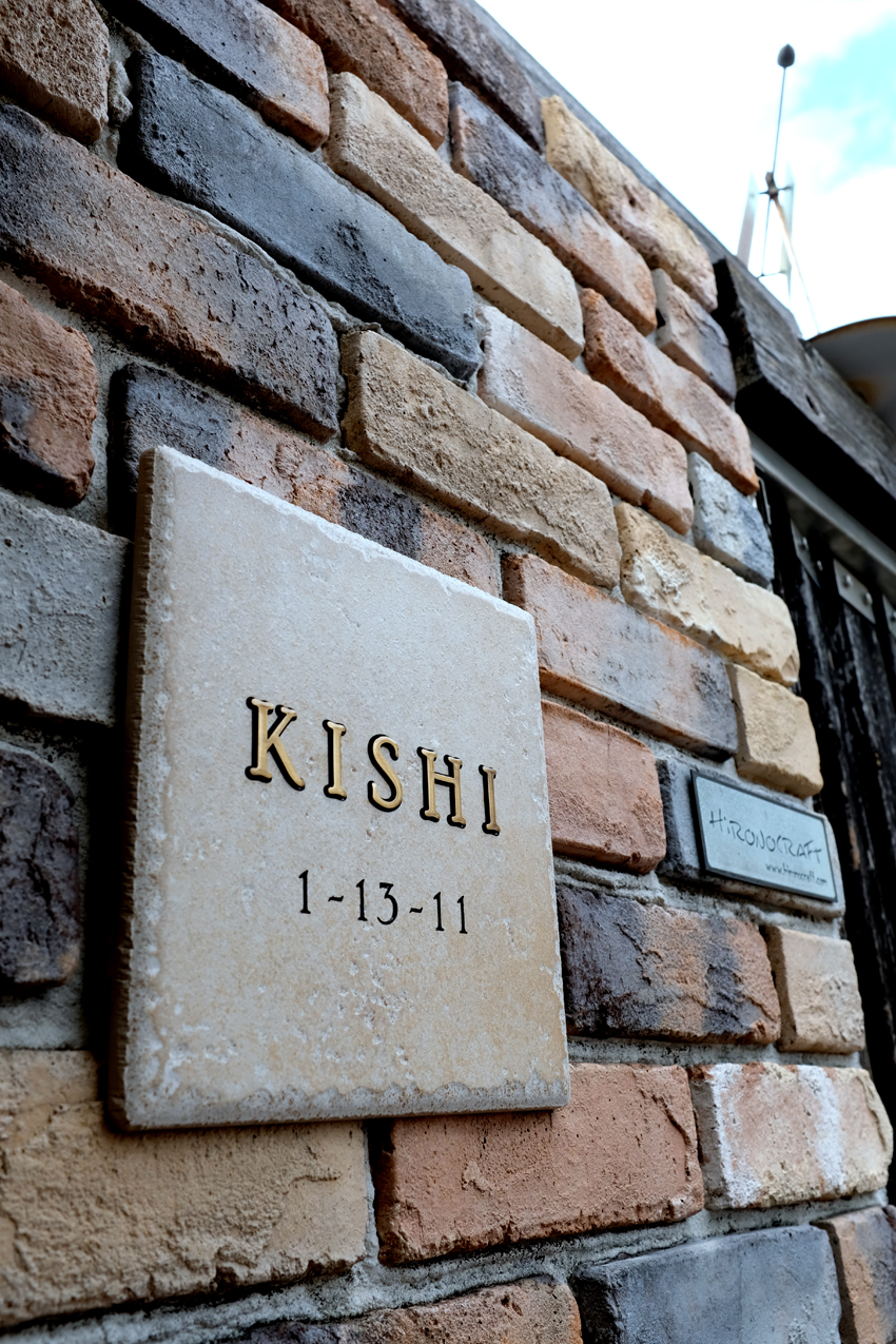 凹凸のあるタイルに真鍮の切り文字を嵌め込んで浮き文字にしています
