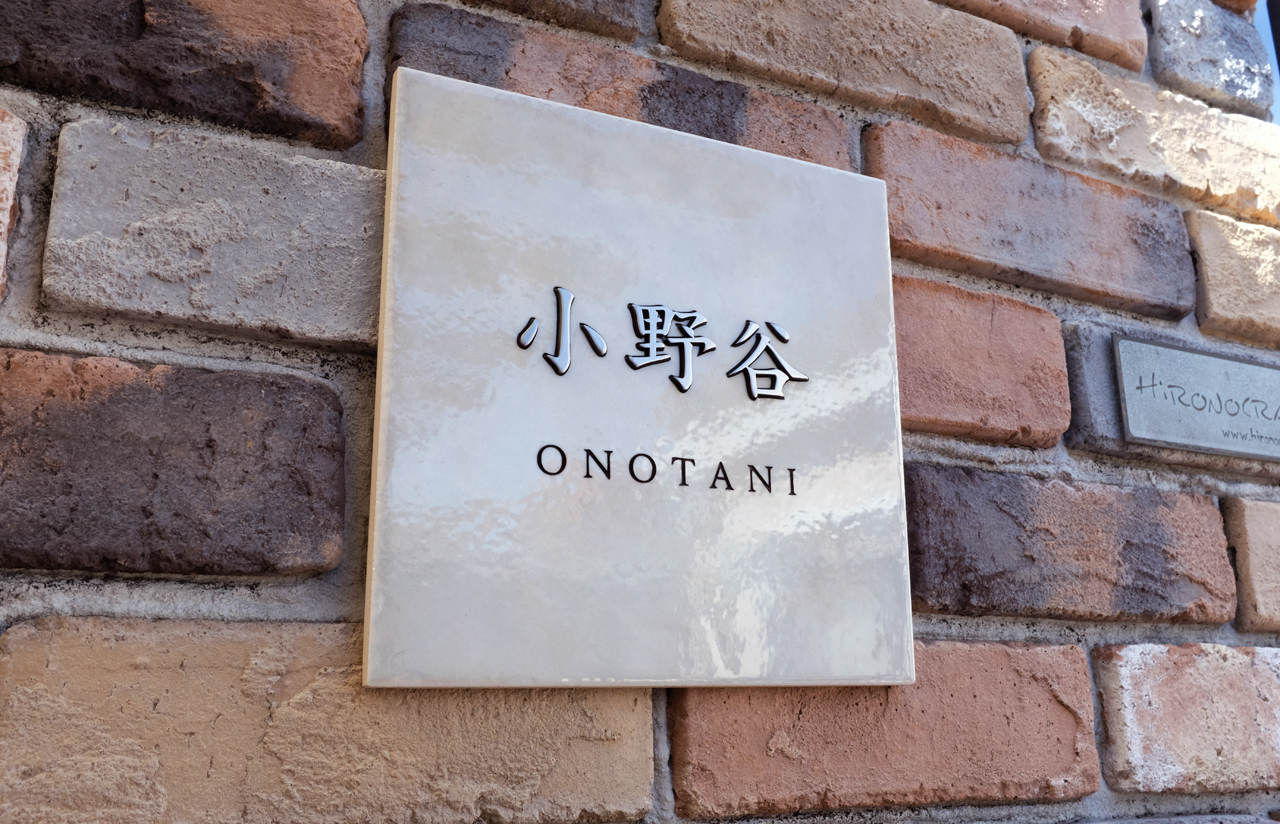 ステンレスの切り文字を彫刻したタイルにはめ込んで浮き文字にしています (象嵌加工)