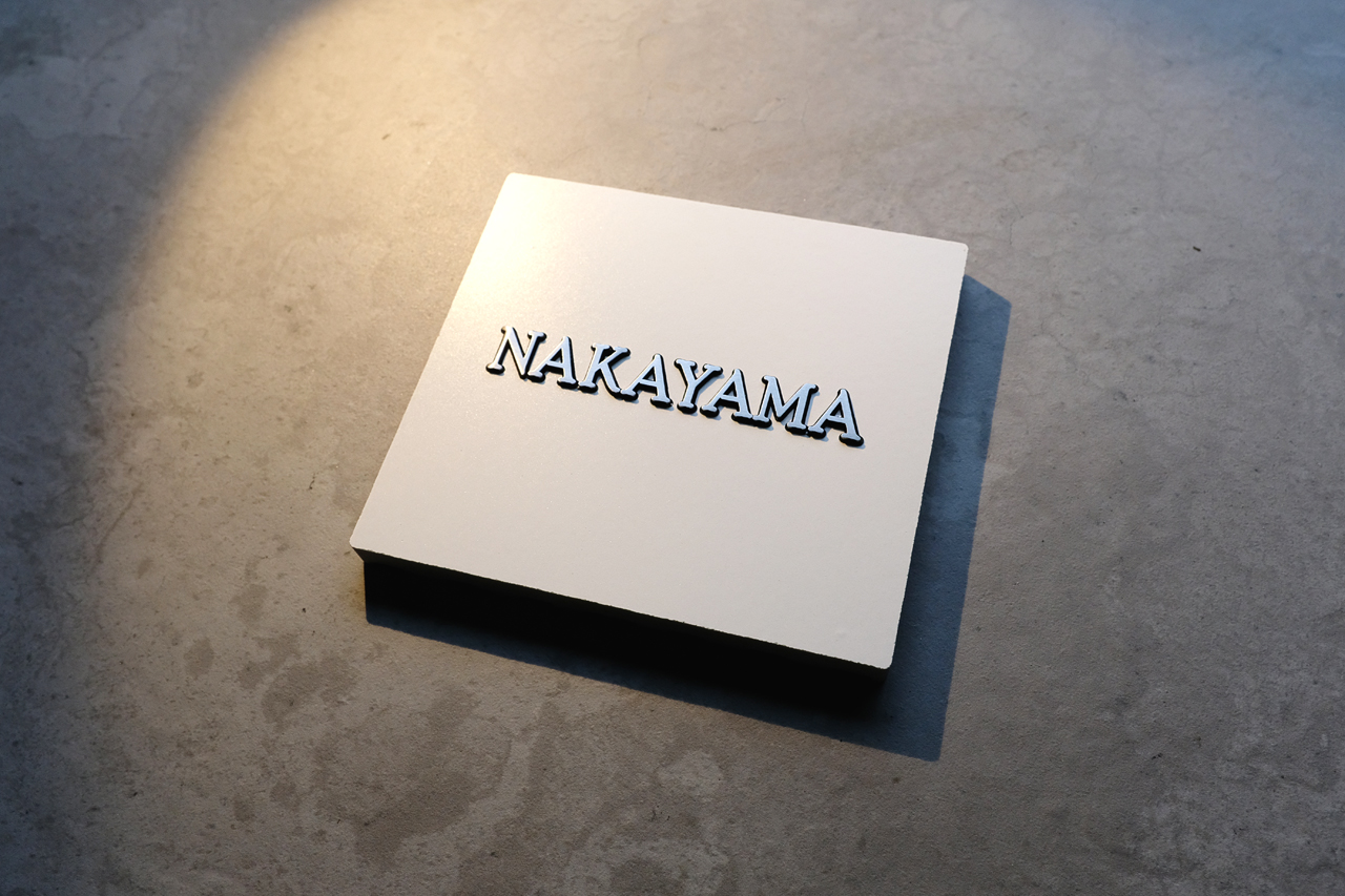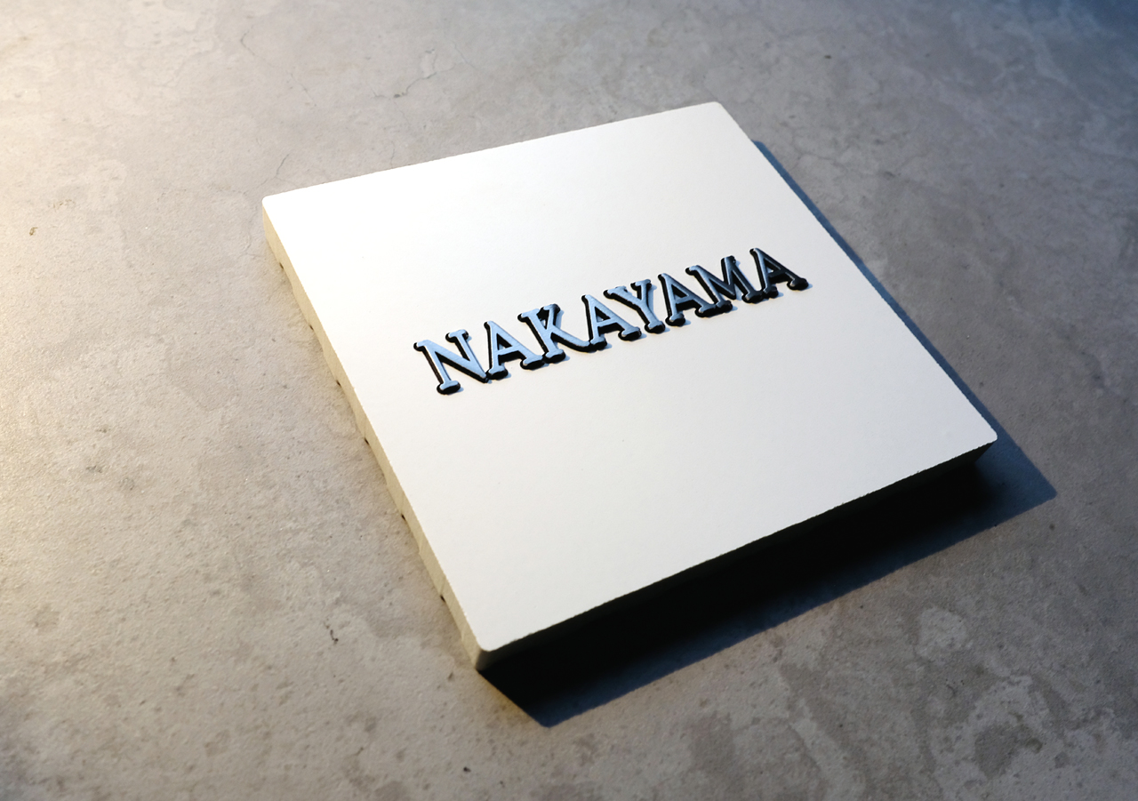 ホワイトタイルにステンレス切り文字を象嵌した表札