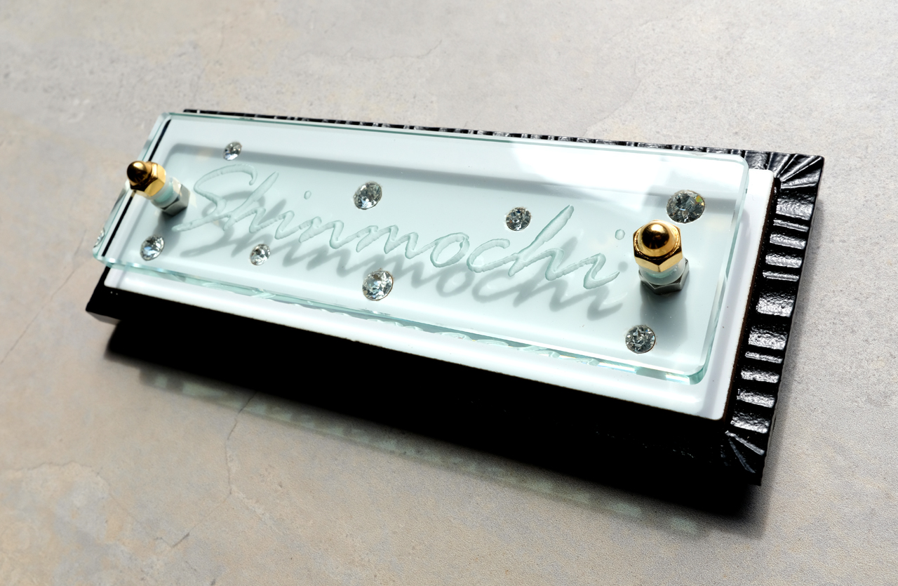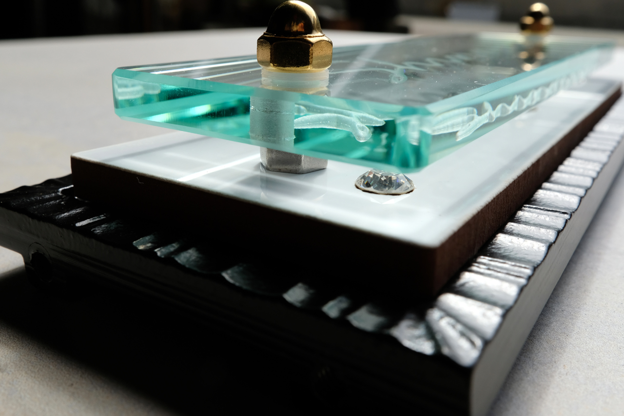 クリアーのスワロフスキーをベースタイルに埋め込んで、立体彫刻したガラスを重ねました