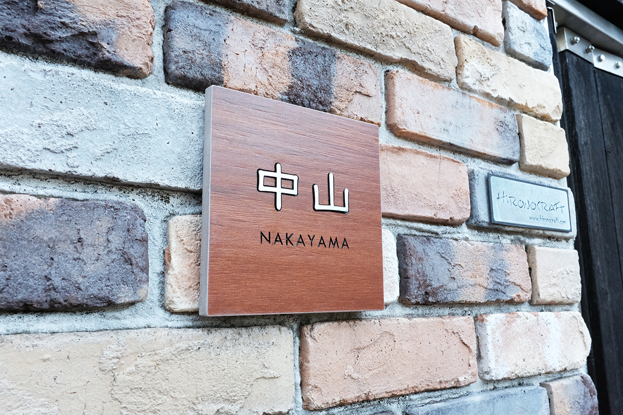 木目調タイルにステンレス象嵌の表札