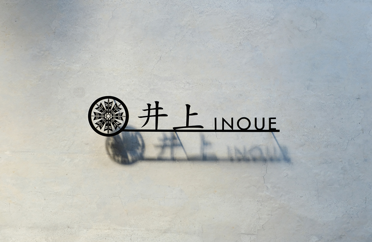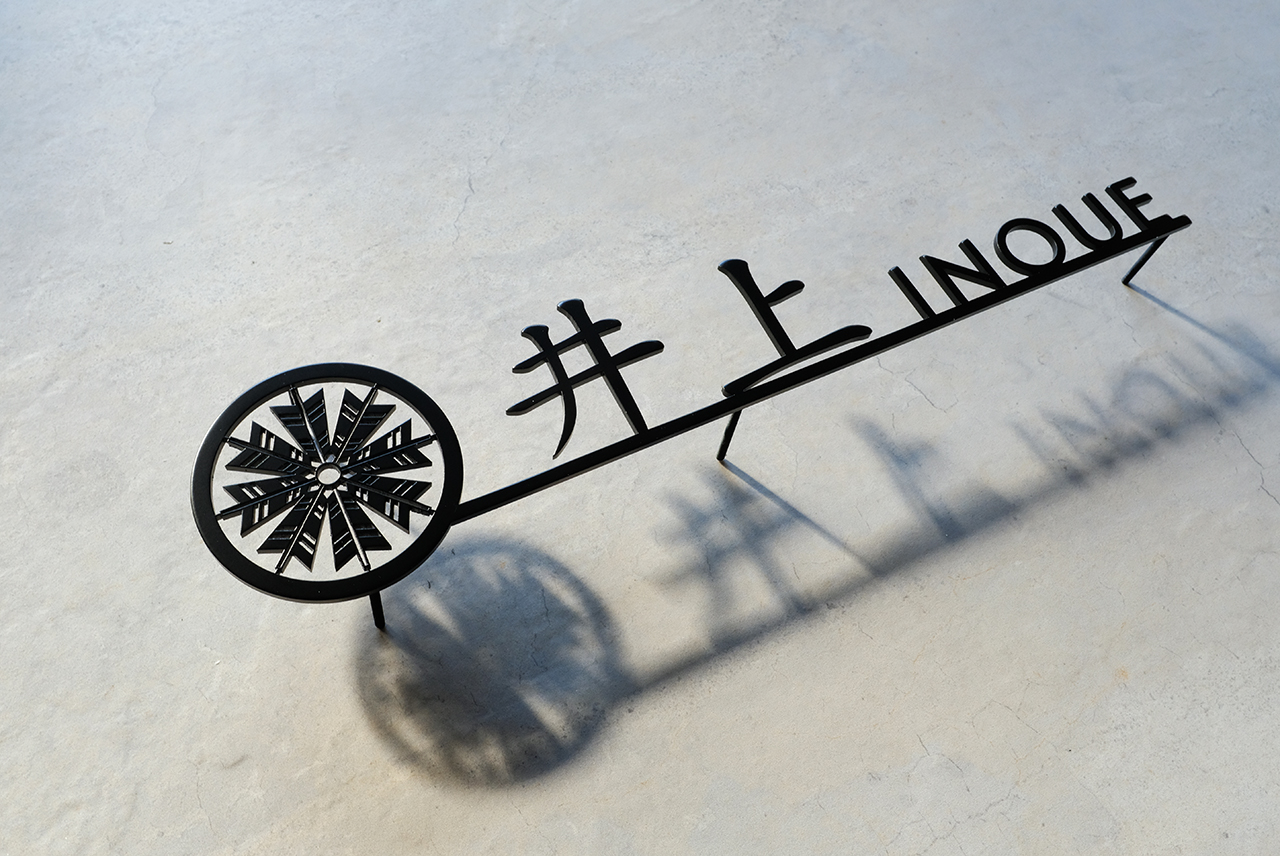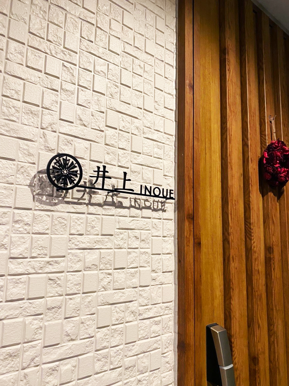 マットブラック仕上げの家紋『丸に八つ矢車』のステンレス切り文字表札