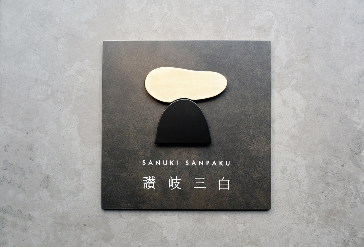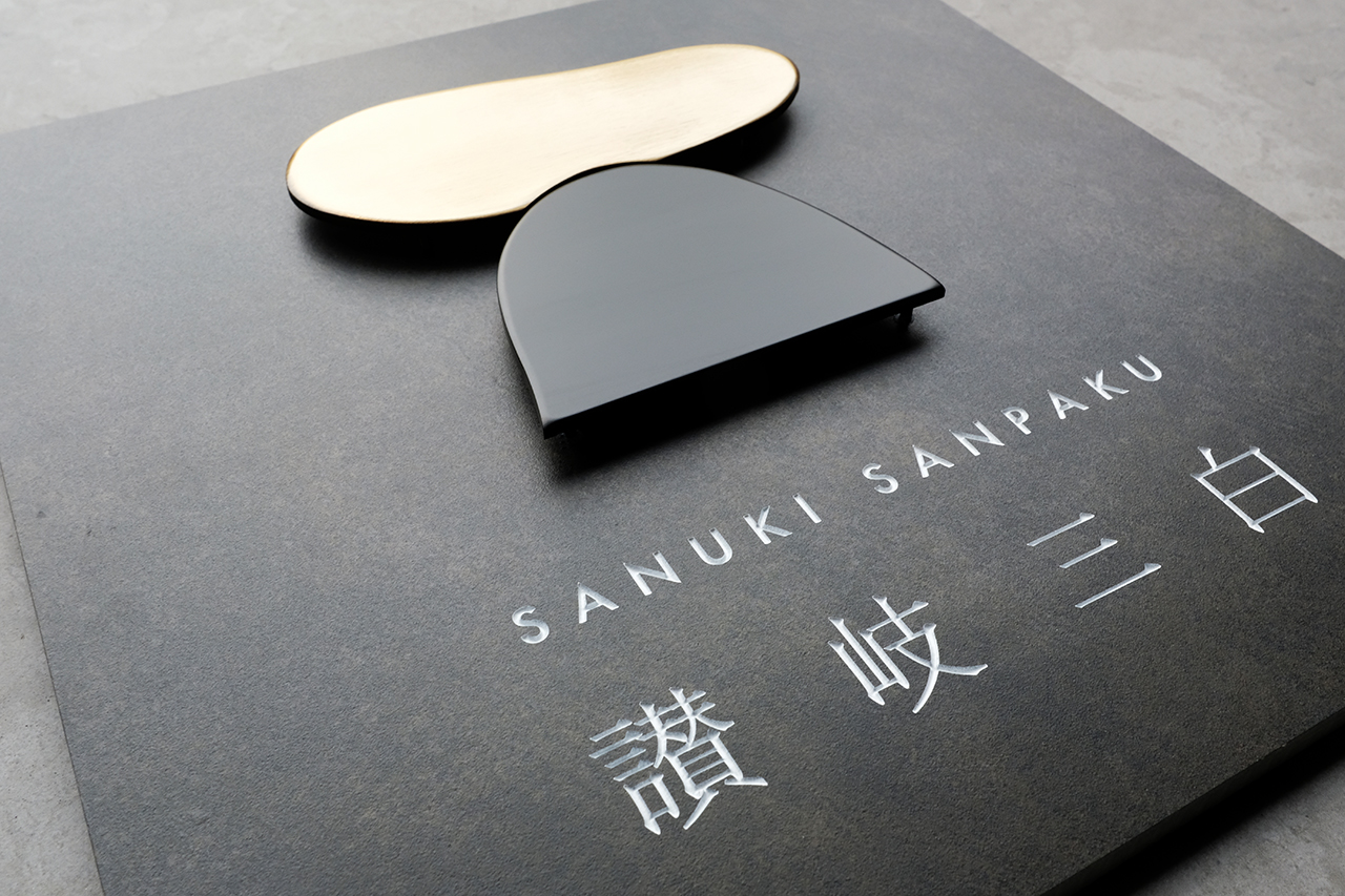 讃岐富士と雲をモチーフにしたロゴはいぶし真鍮とマットブラックのステンレスで表現
