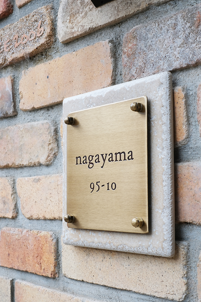 アンティークタイル(ホワイト)にいぶし真鍮のプレートのフリースタイル表札