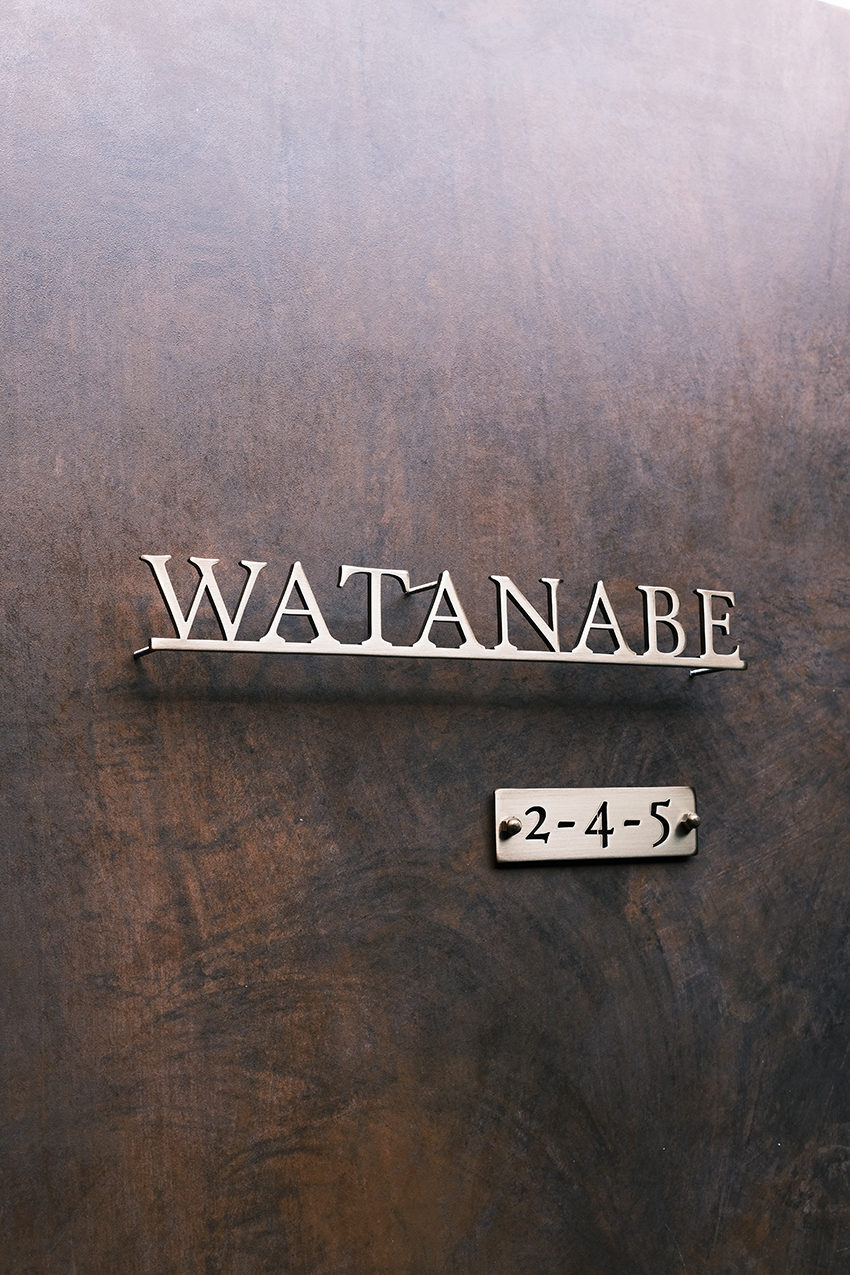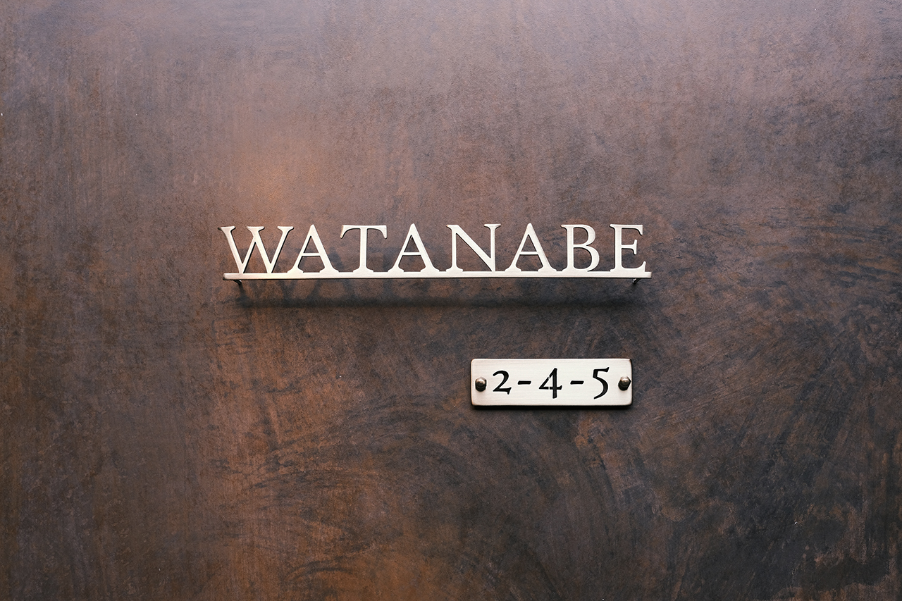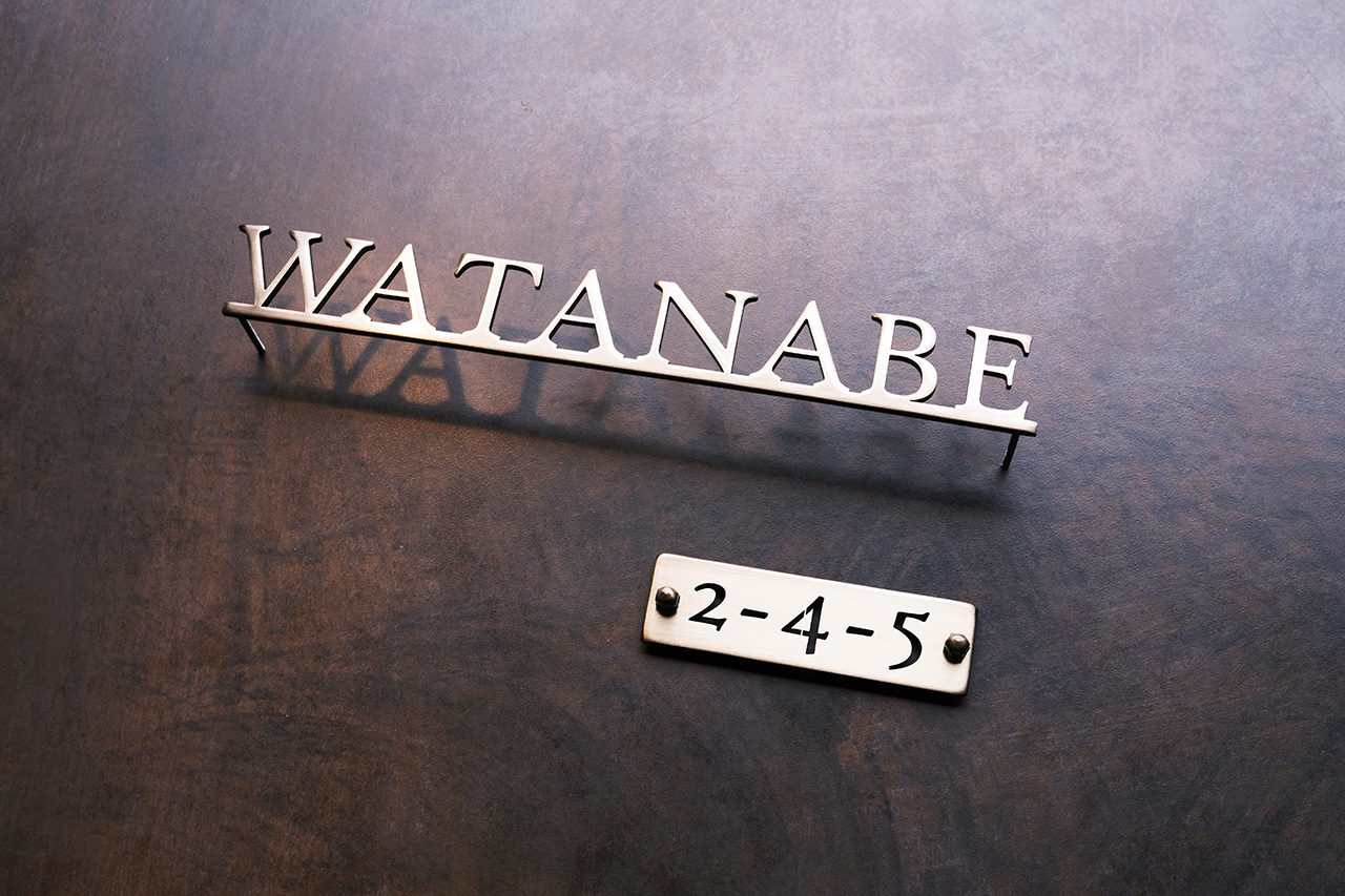 いぶし仕上げの真鍮切り文字表札と番地プレート