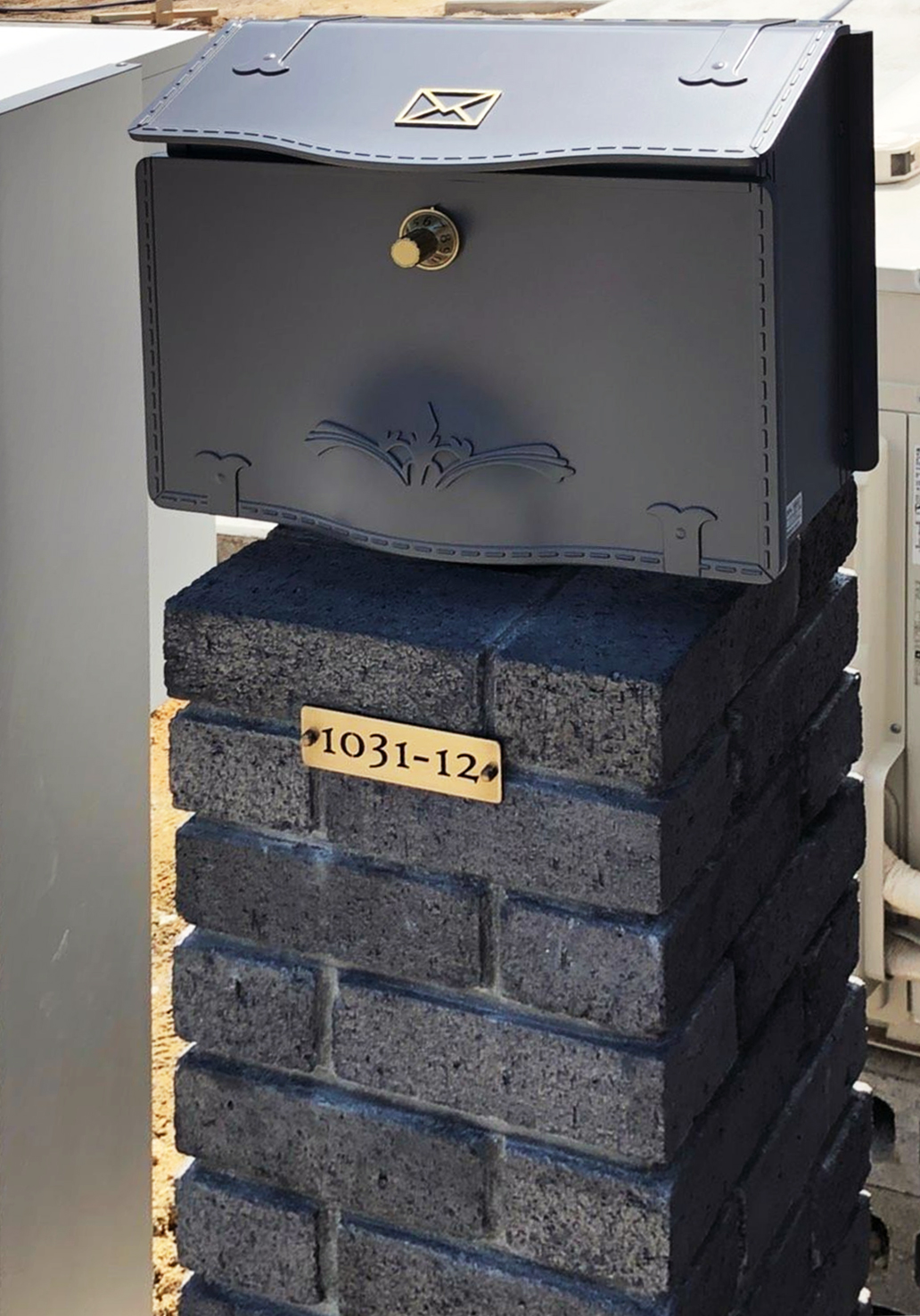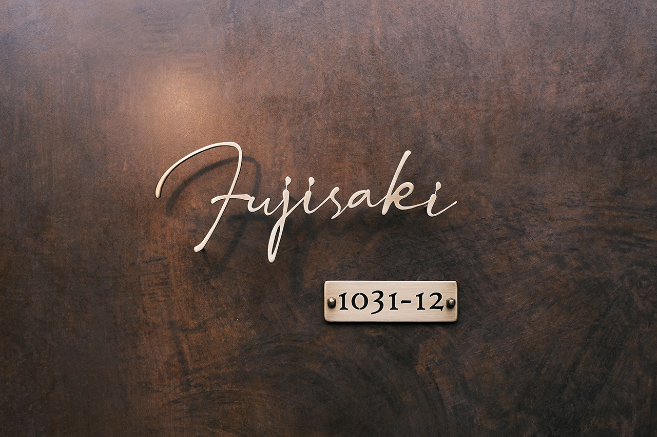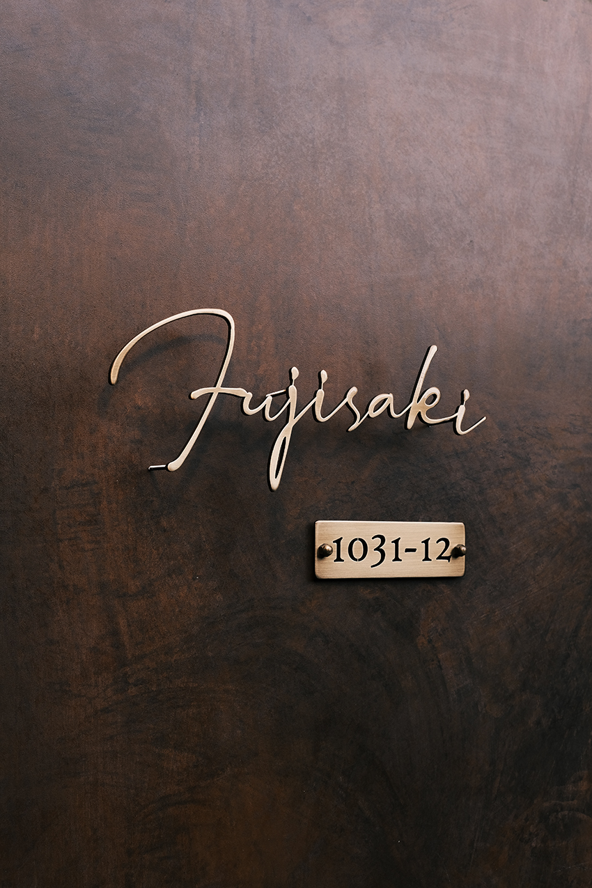 いぶし仕上げの真鍮切り文字表札と番地プレート