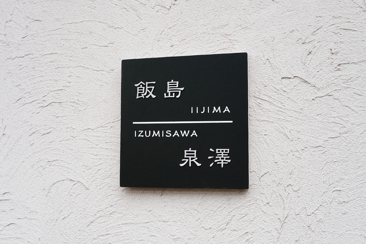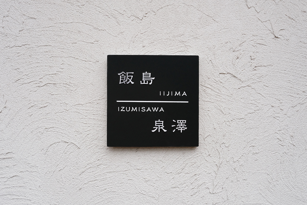 マットブラックタイルにステンレス象嵌の二世帯の表札