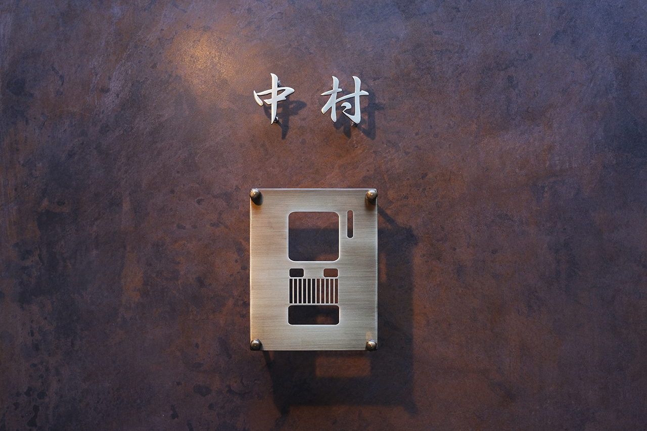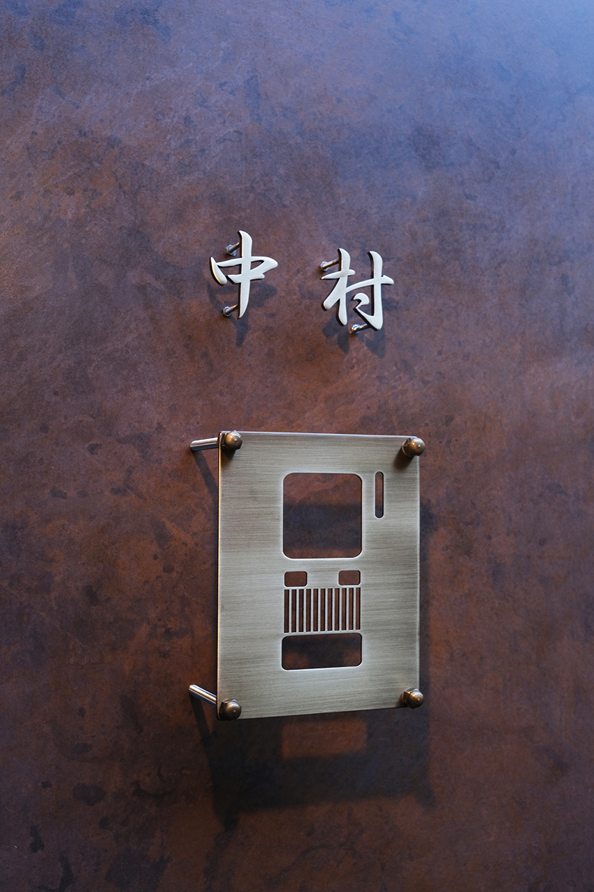 いぶし仕上げの真鍮切り文字表札と真鍮インターホンカバー