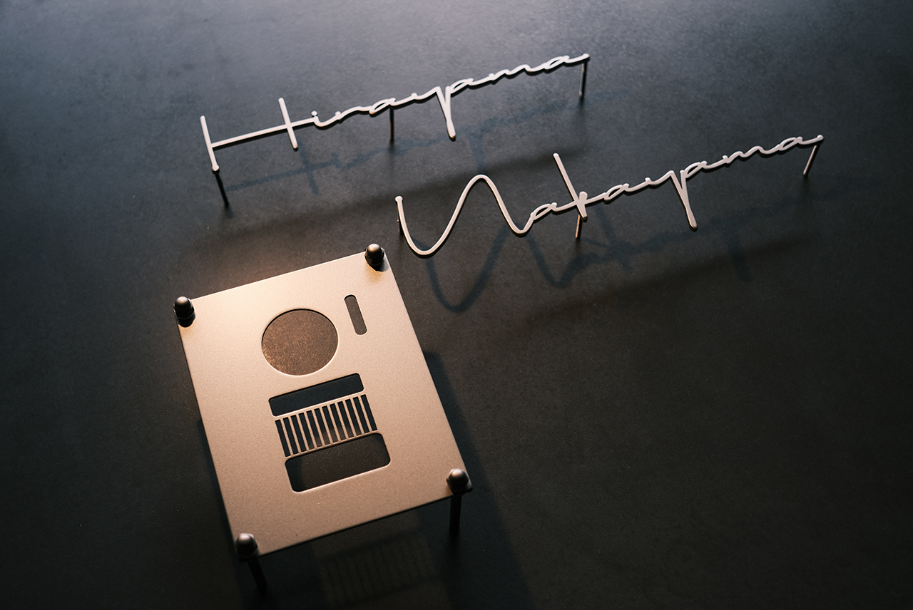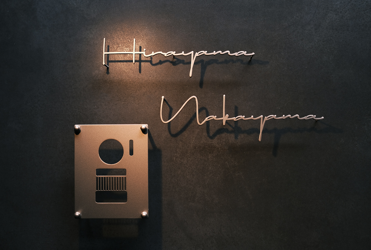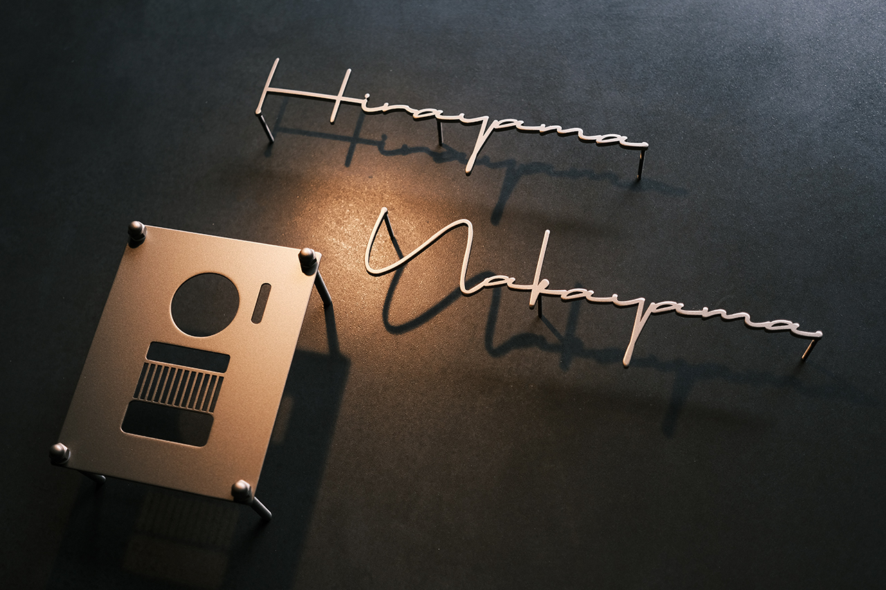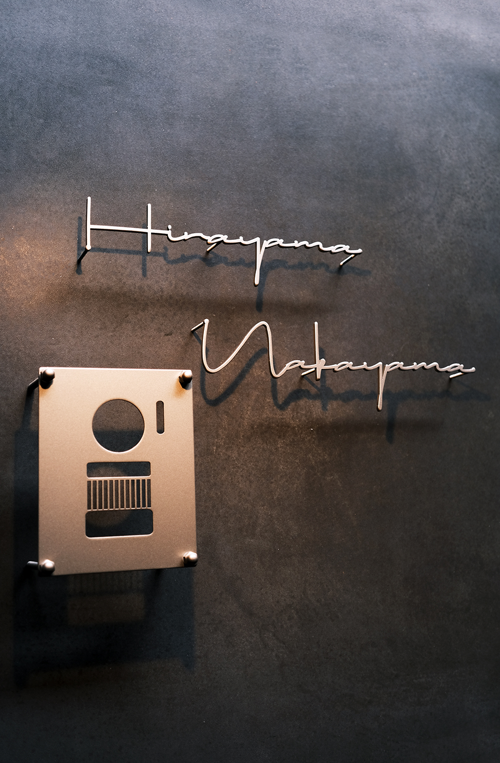 マットゴールド仕上げのステンレス切り文字表札とインターホンカバー