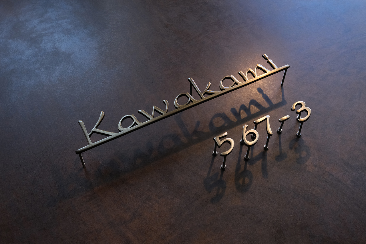 いぶし仕上げの真鍮切り文字表札とハウスナンバー