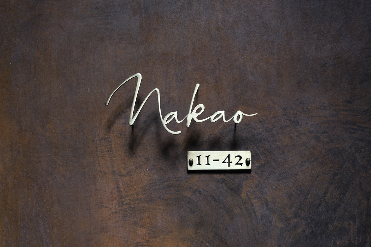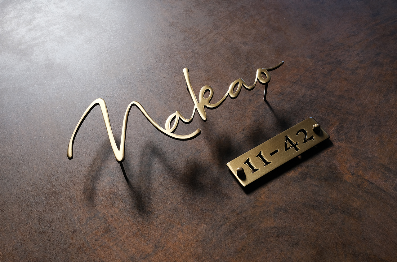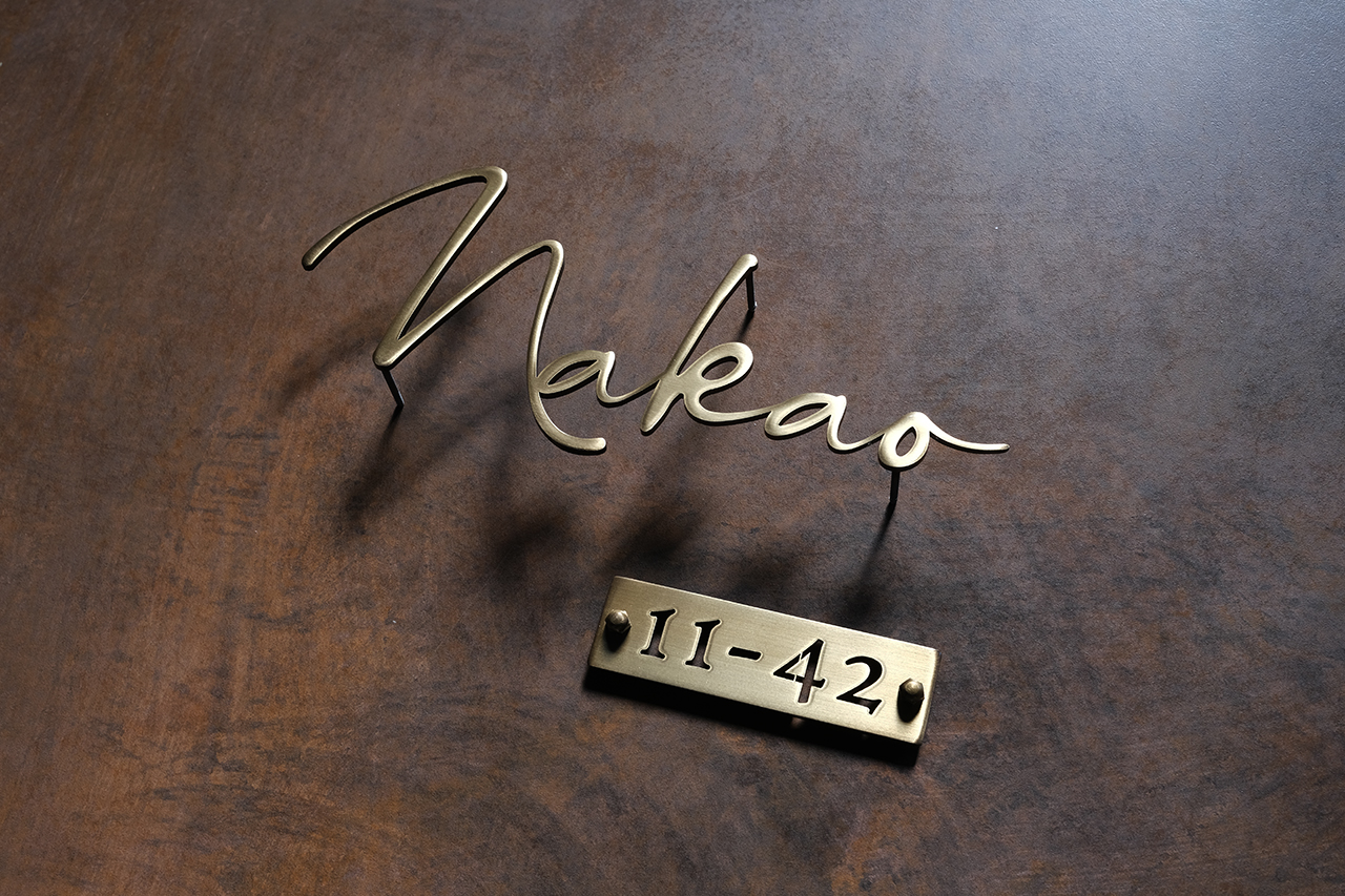 いぶし仕上げの真鍮切り文字表札と番地プレート