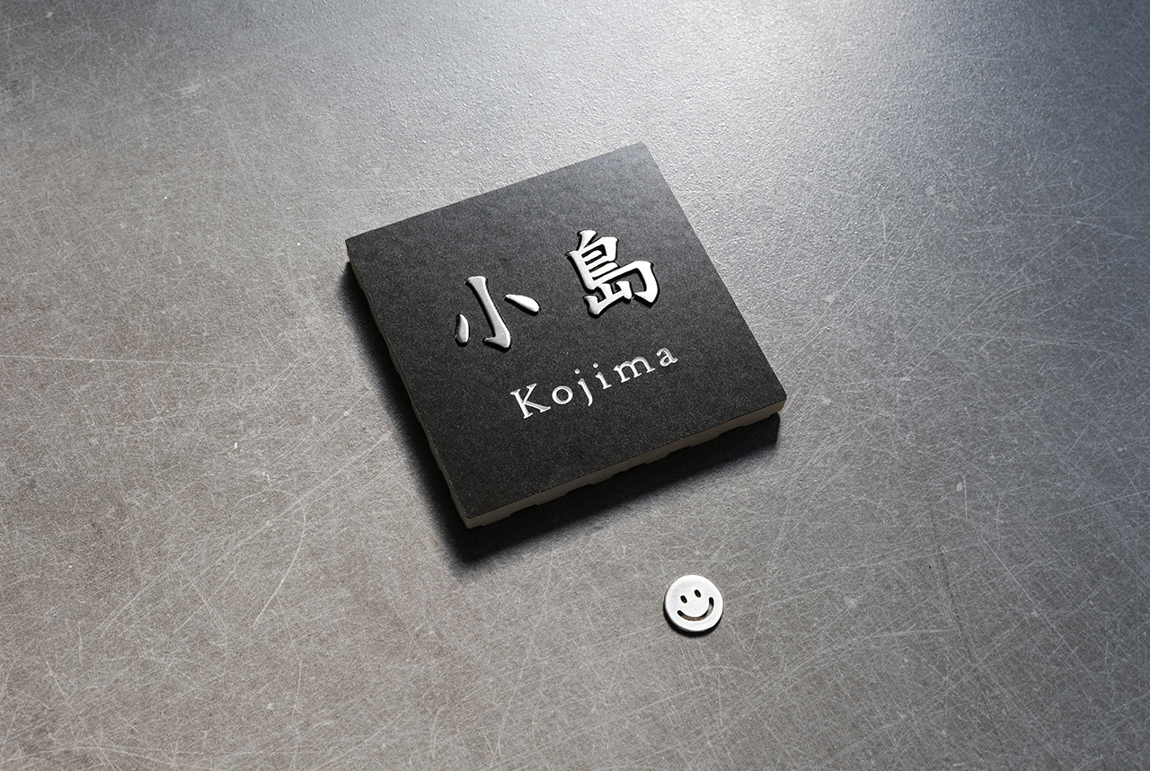 研摩仕上げのステンレスの切り文字をタイルにはめ込み浮かせて固定(象嵌)