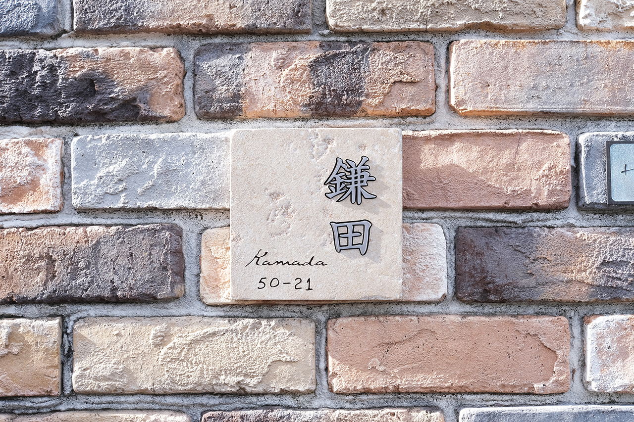 ホワイトのアンティークタイルにステンレス象嵌の表札