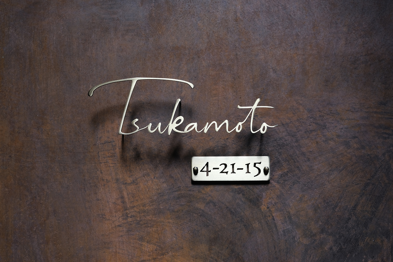 いぶし仕上げの真鍮切り文字表札と番地プレート
