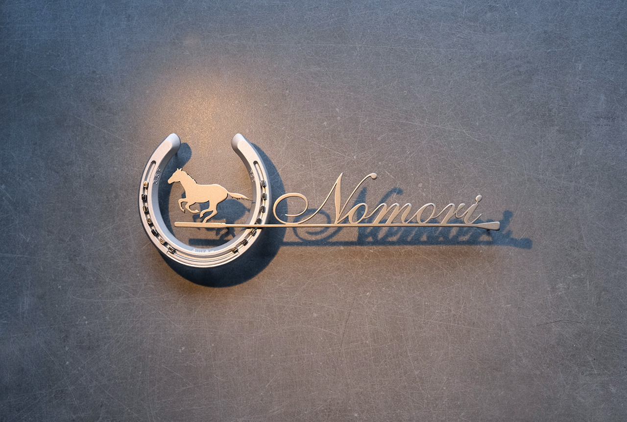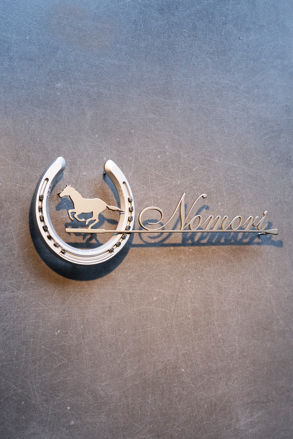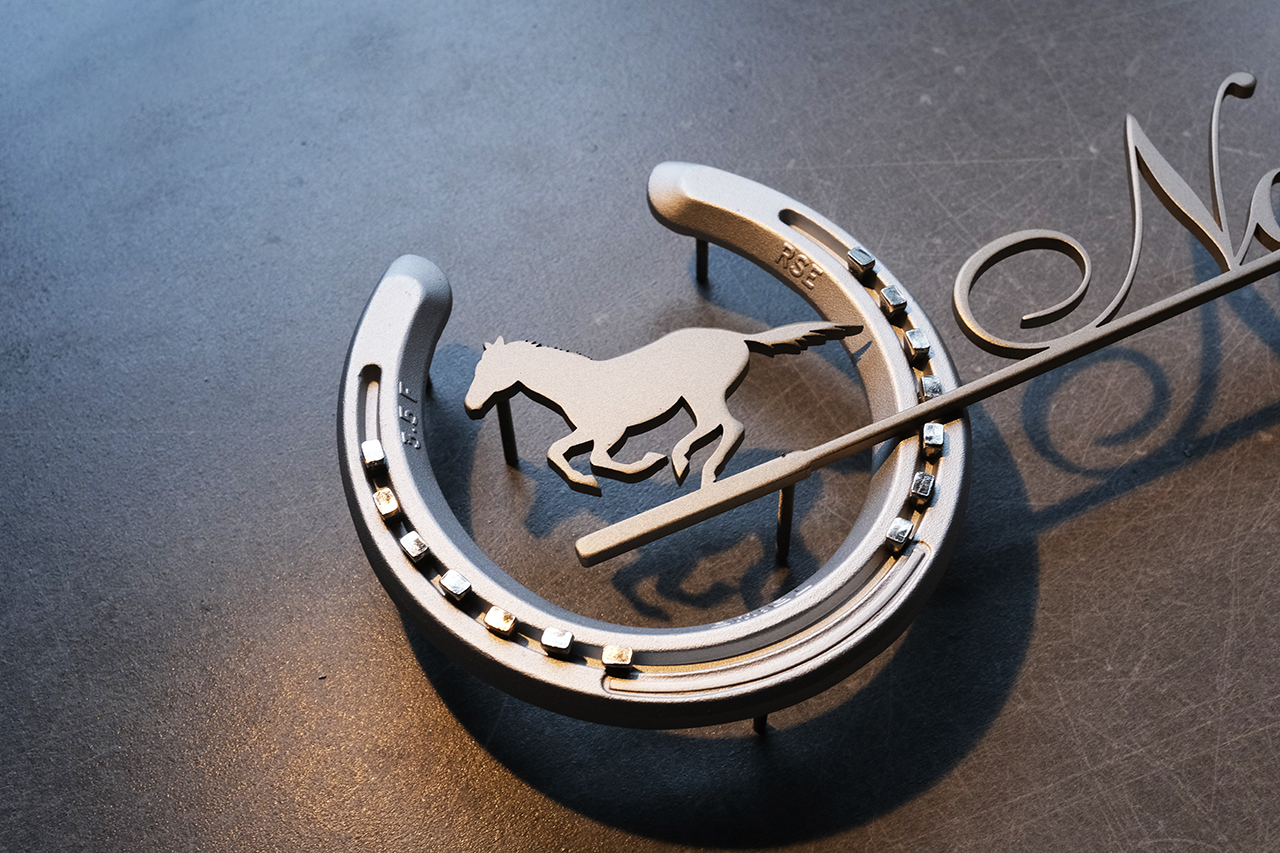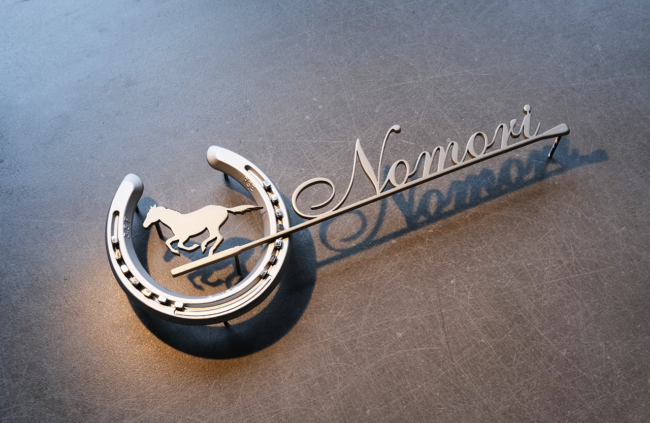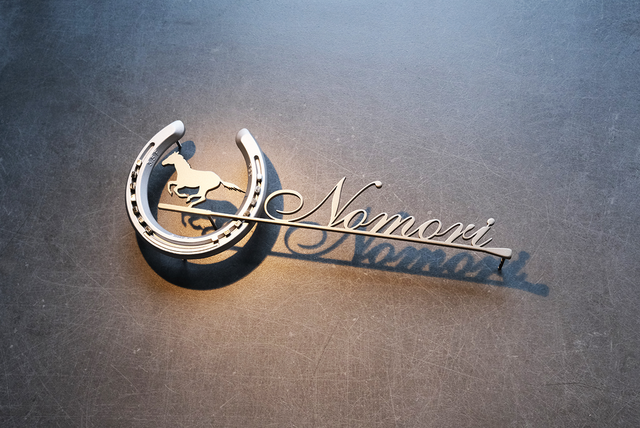 競走馬の未使用の本物の蹄鉄を使って製作した創作表札