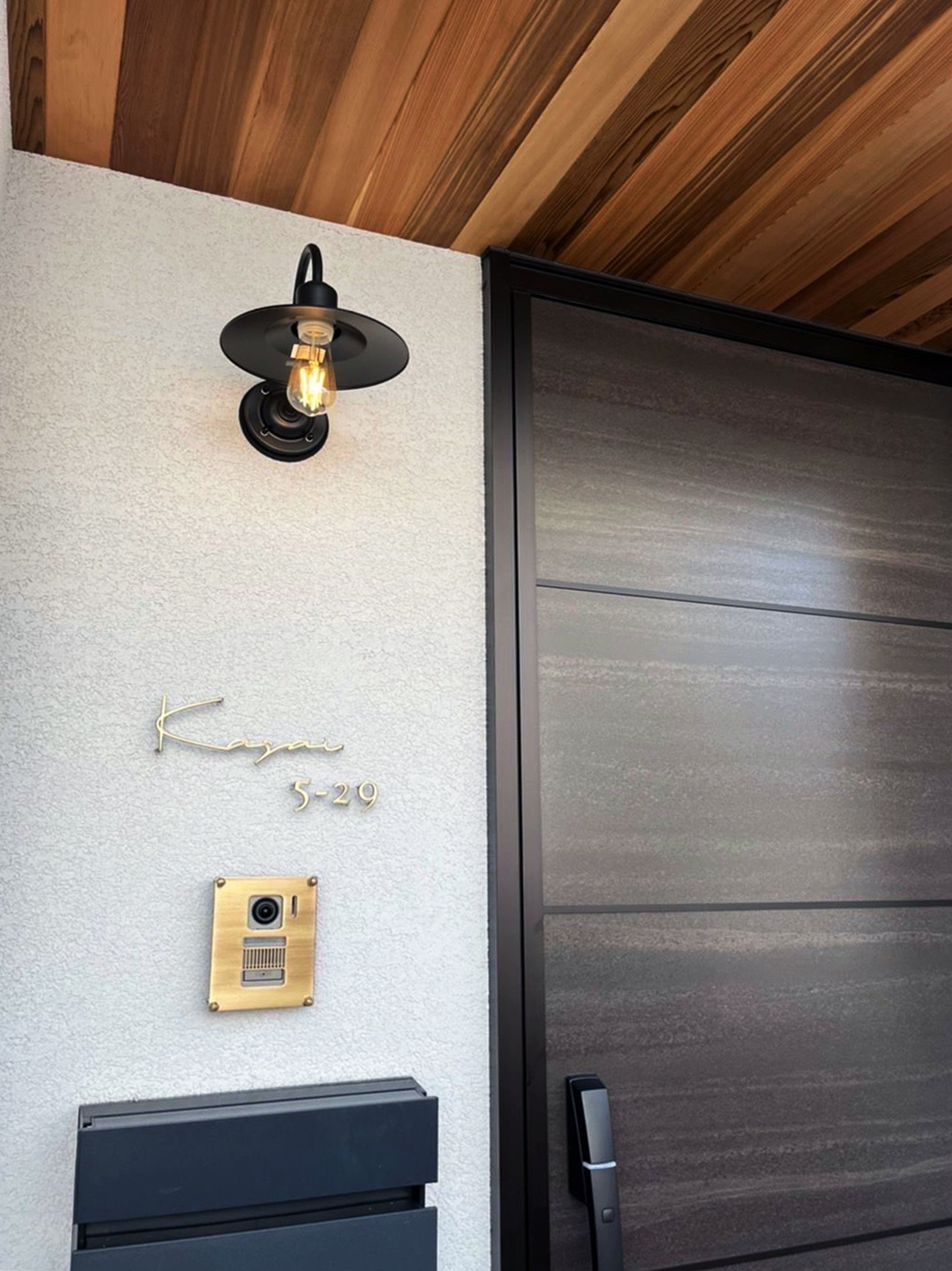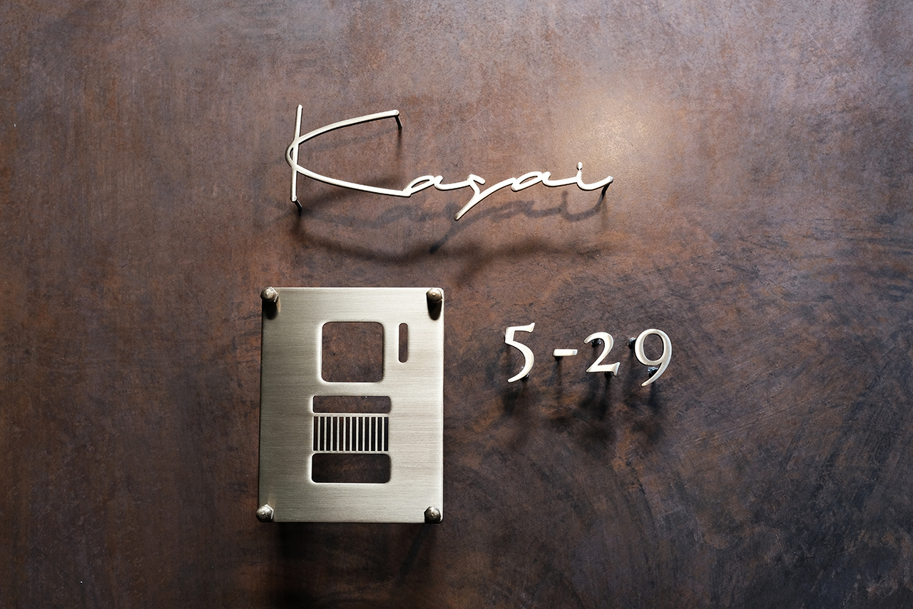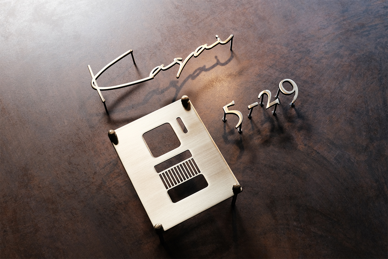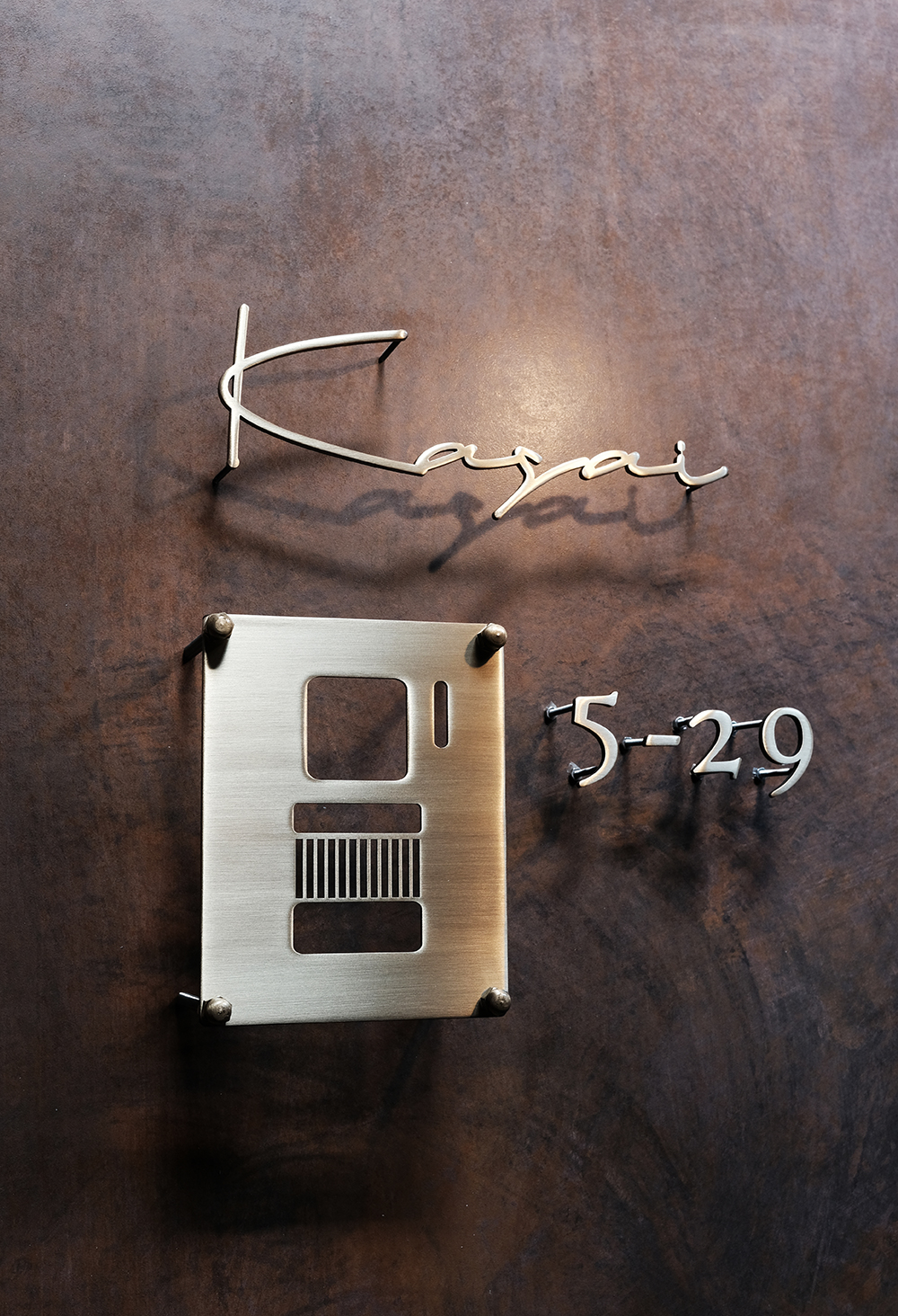 いぶし仕上げの真鍮切り文字表札、ハウスナンバーとインターホンカバー