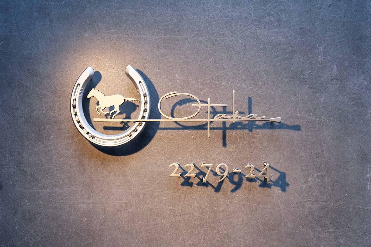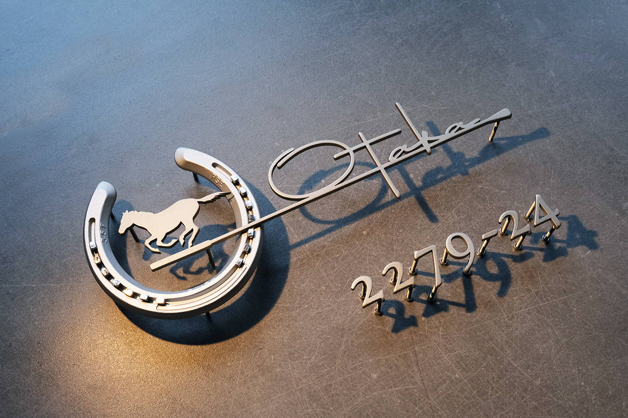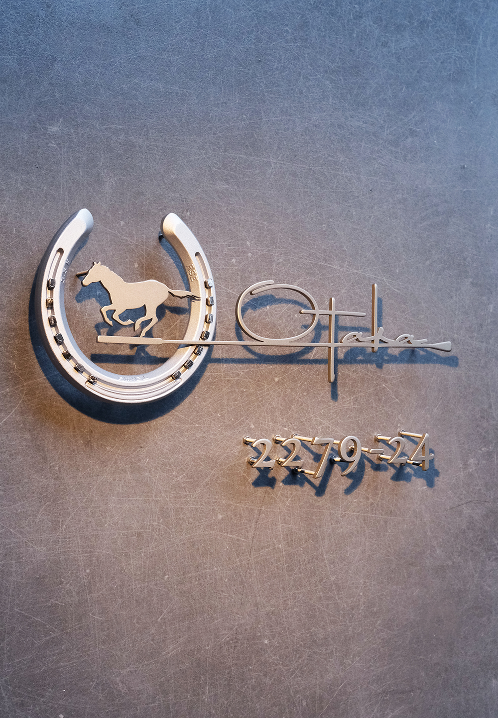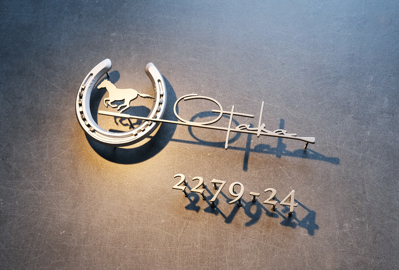 競走馬の未使用の本物の蹄鉄を使って製作した創作表札