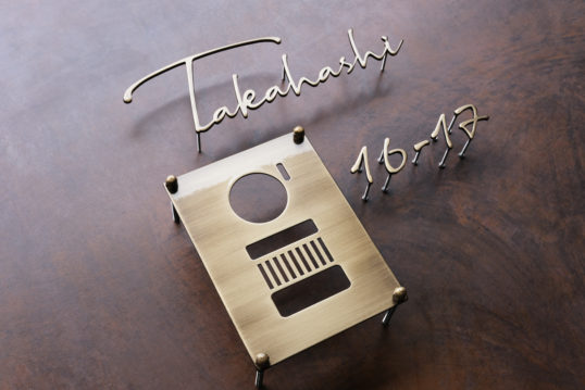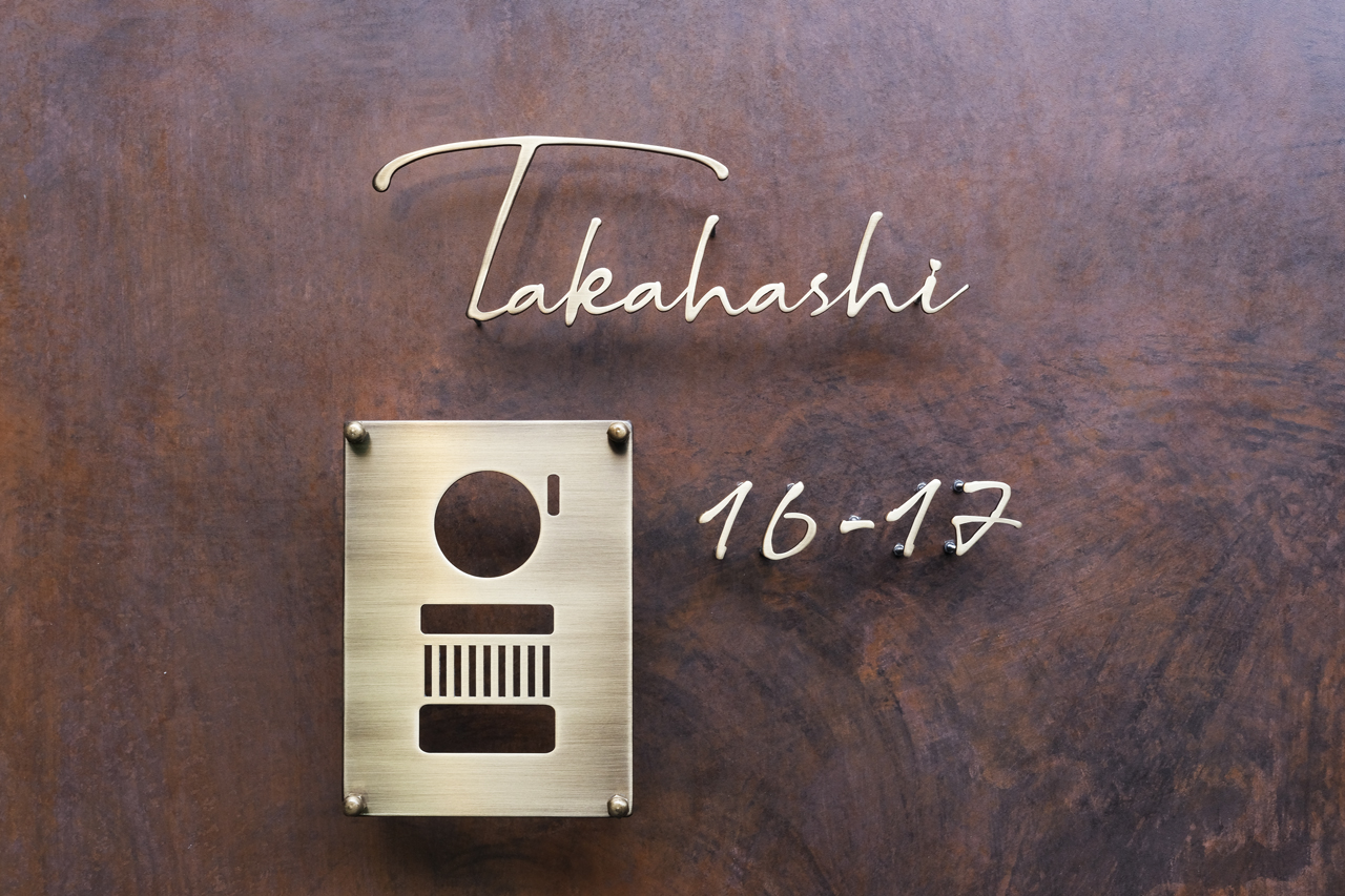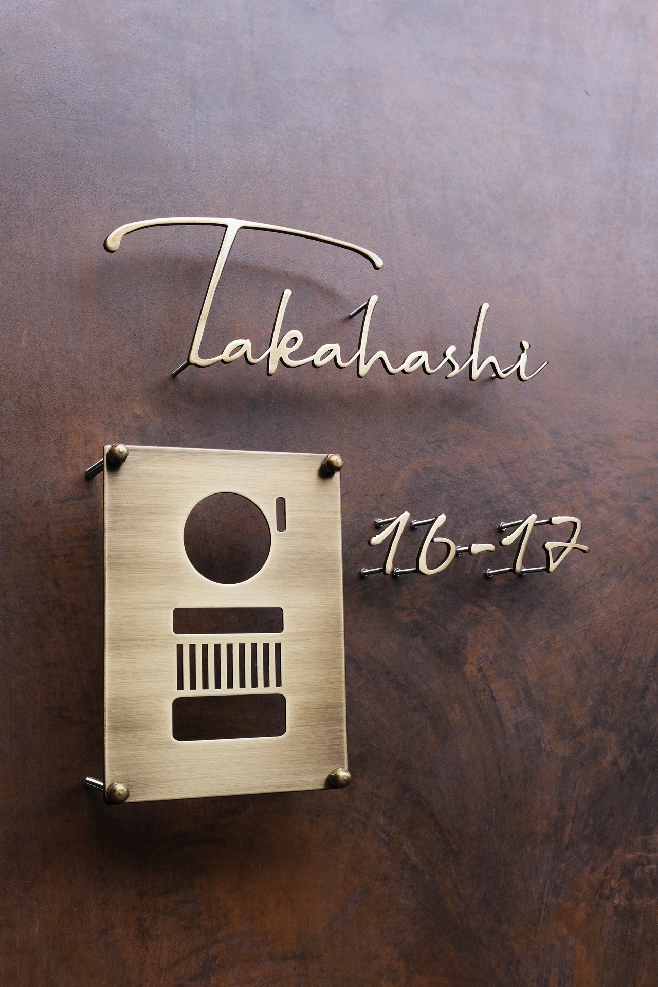 いぶし仕上げの真鍮切り文字表札、ハウスナンバーとインターホンカバー