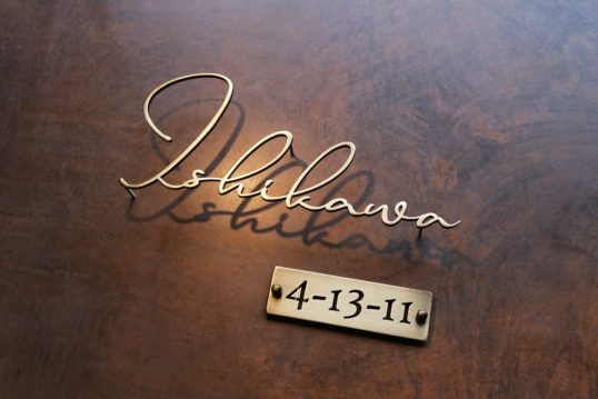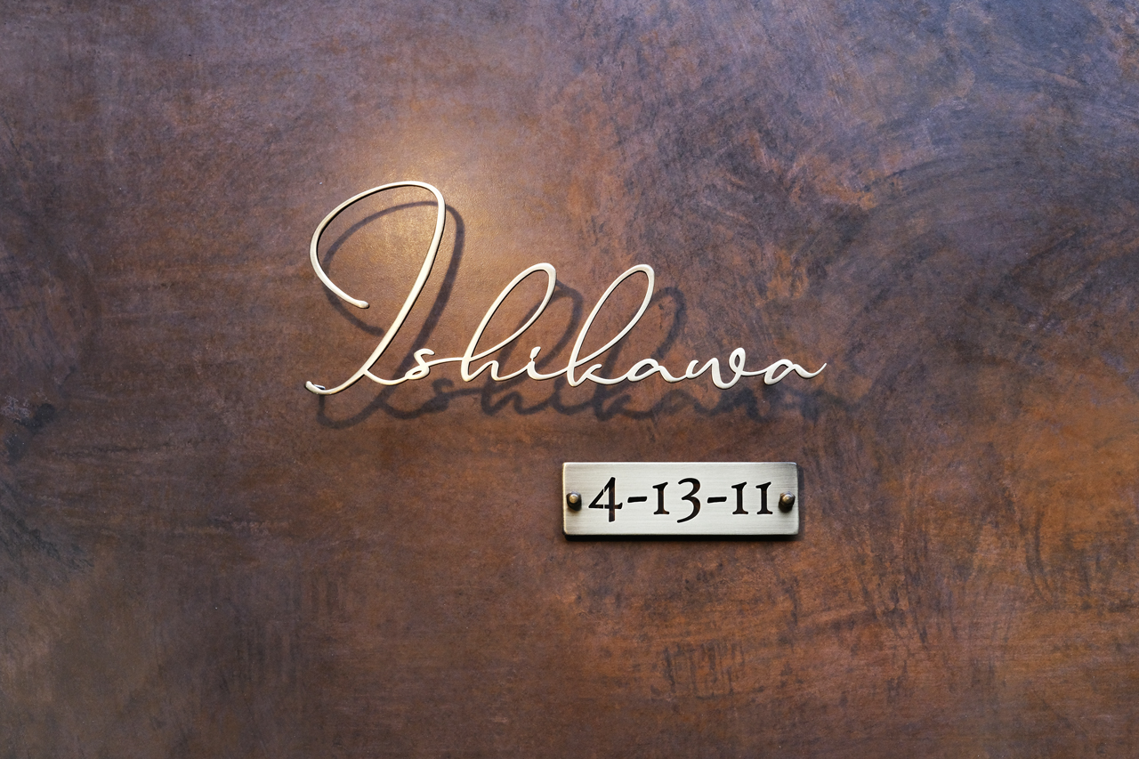 いぶし仕上げの真鍮切り文字表札と番地プレート