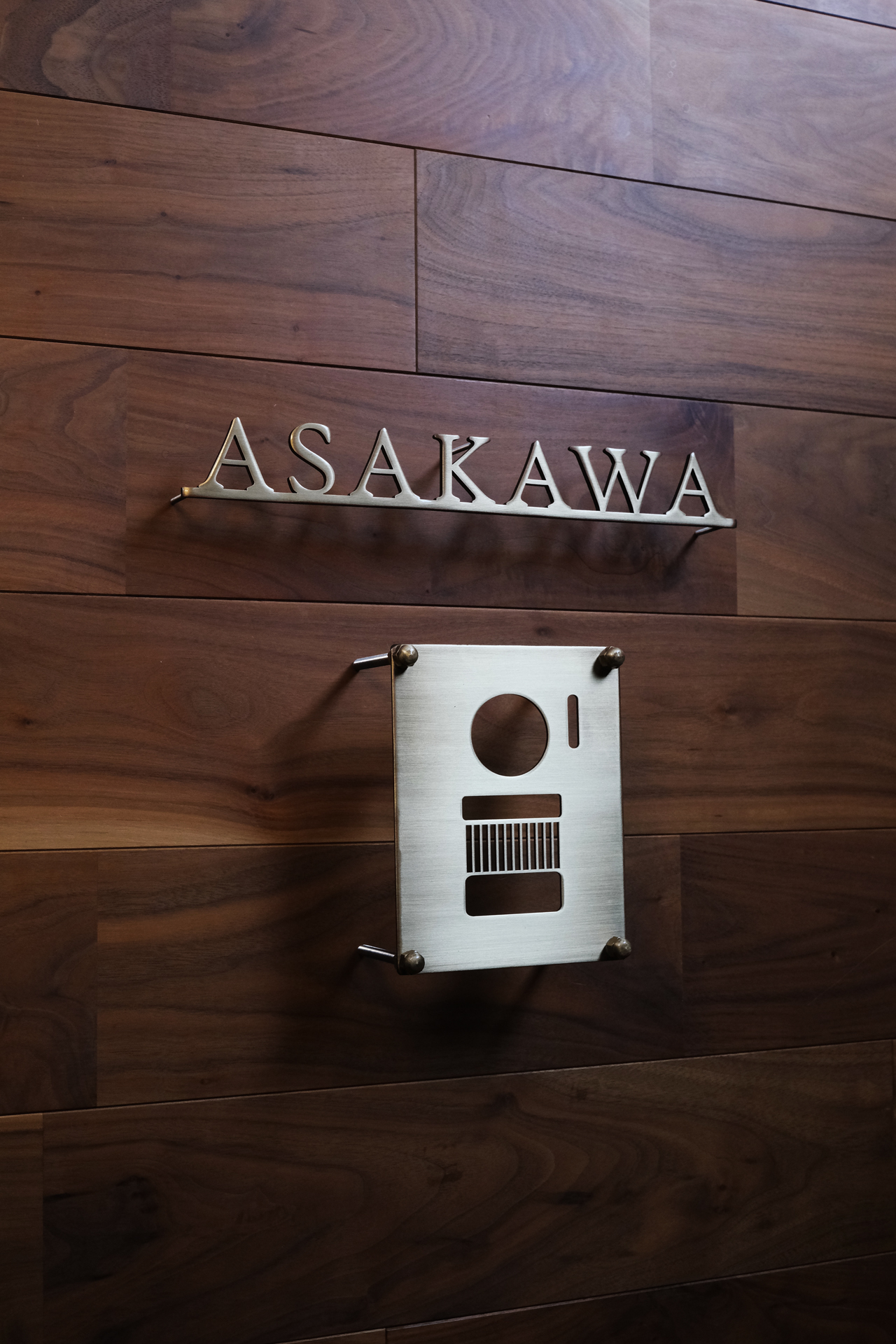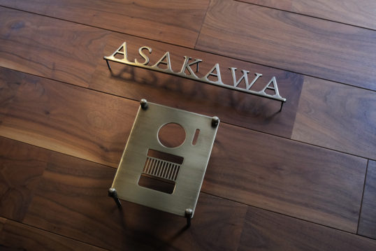 いぶし仕上げの真鍮切り文字表札と真鍮インターホンカバー
