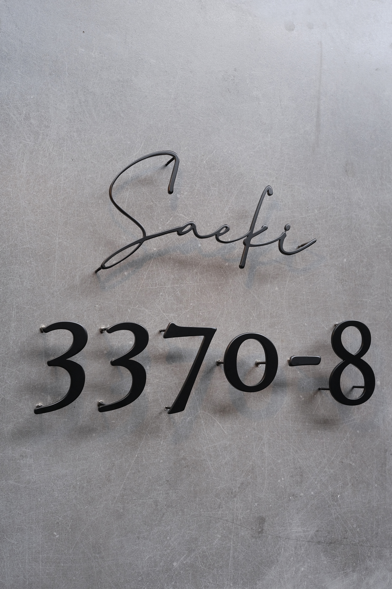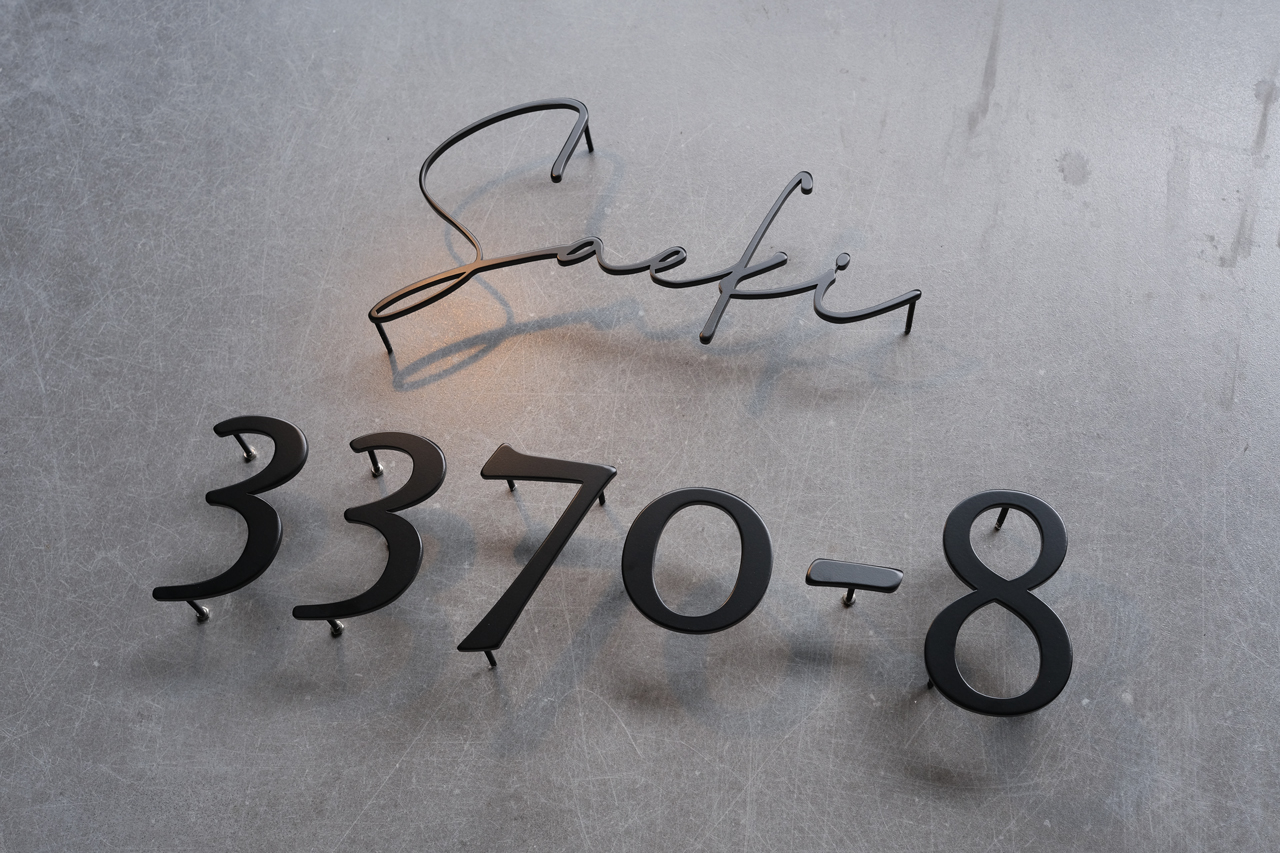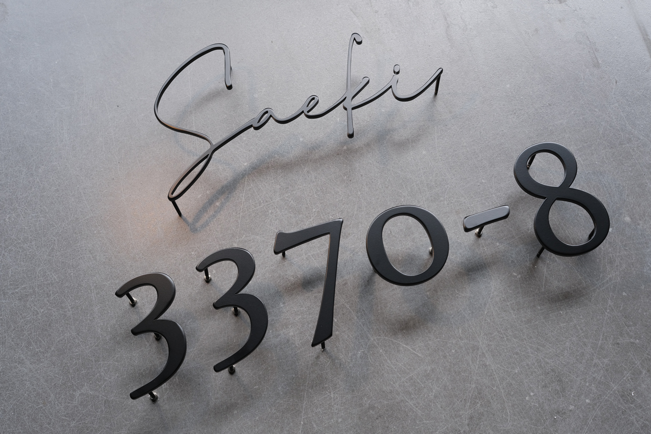 マットブラック焼付塗装のステンレス切り文字表札とハウスナンバー
