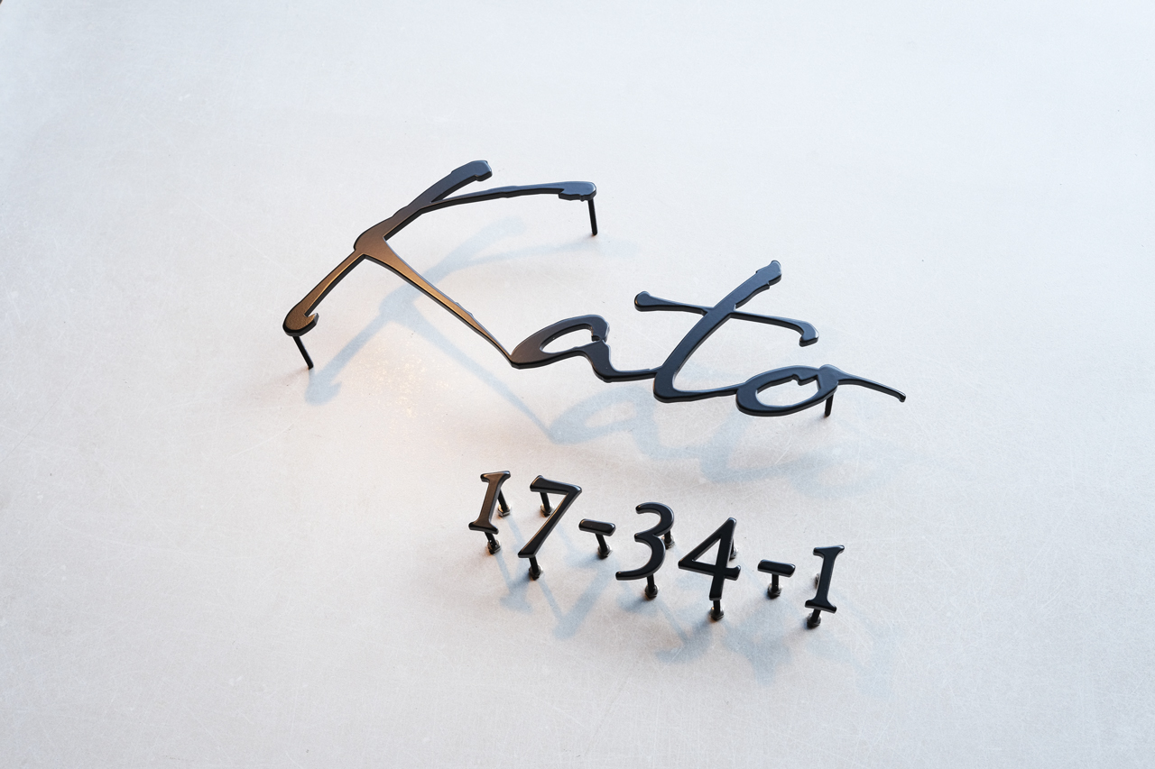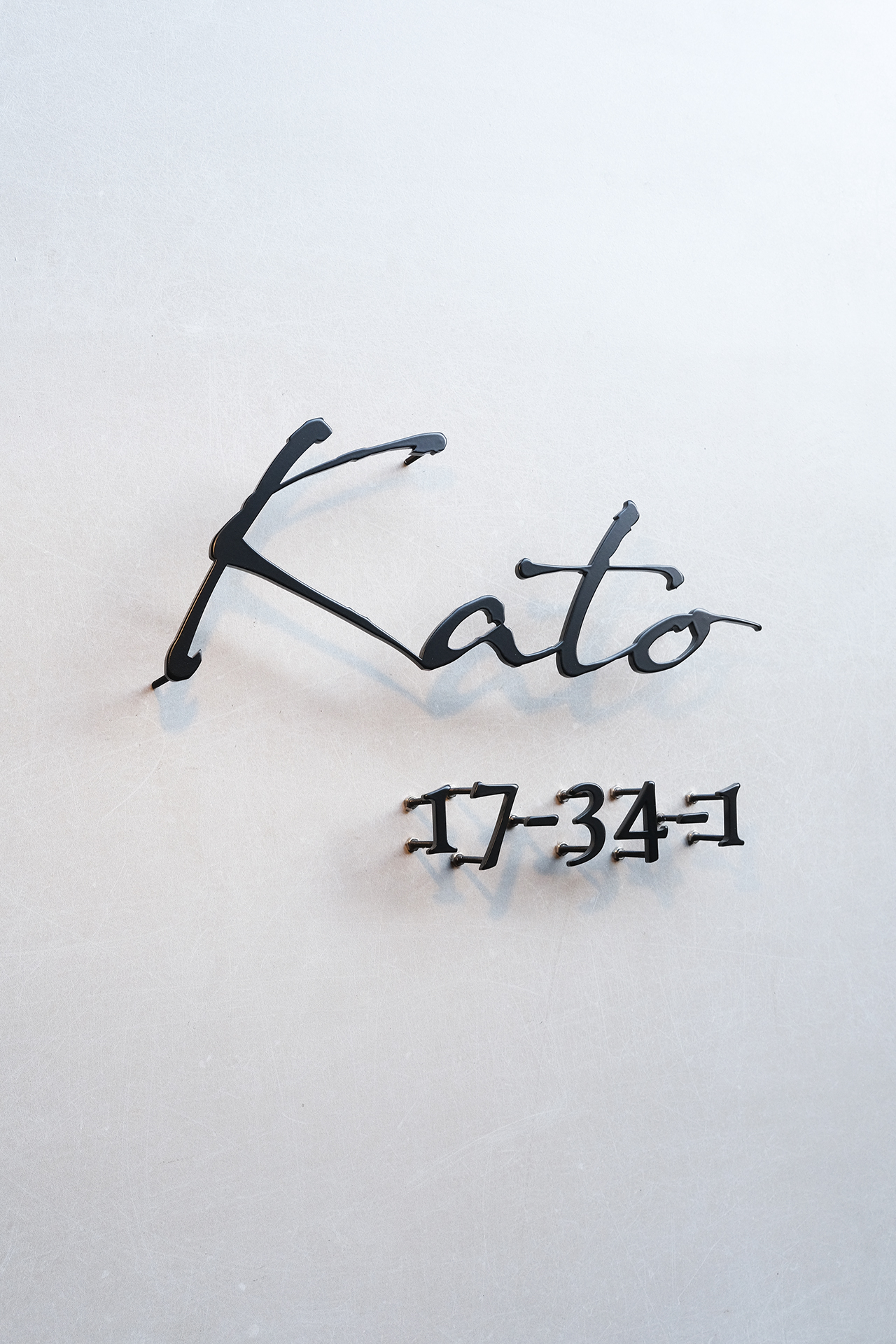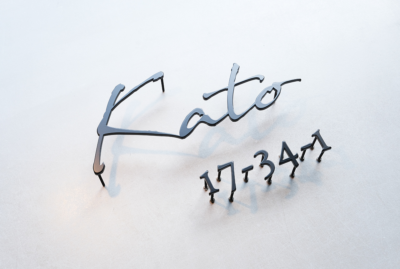 マットブラックのステンレス切り文字表札とハウスナンバー