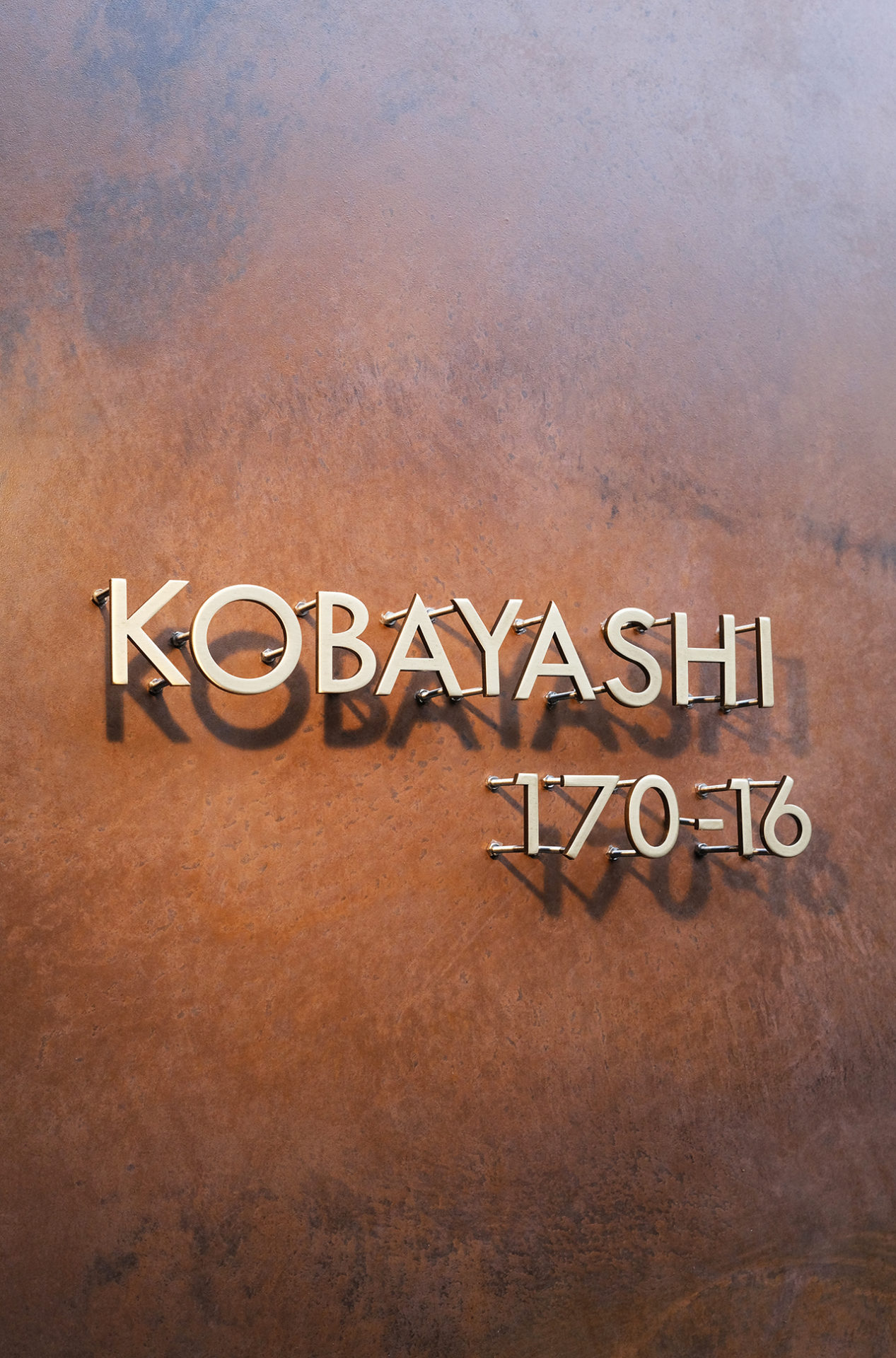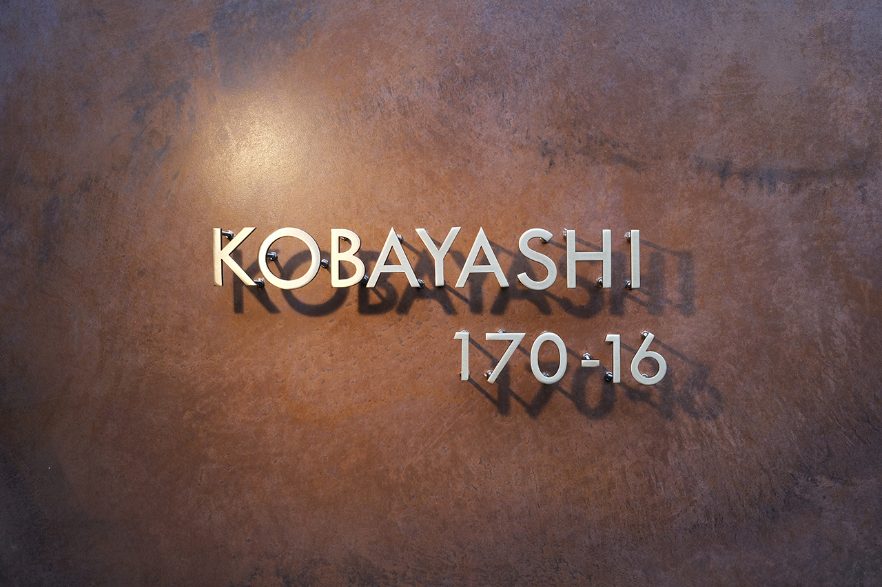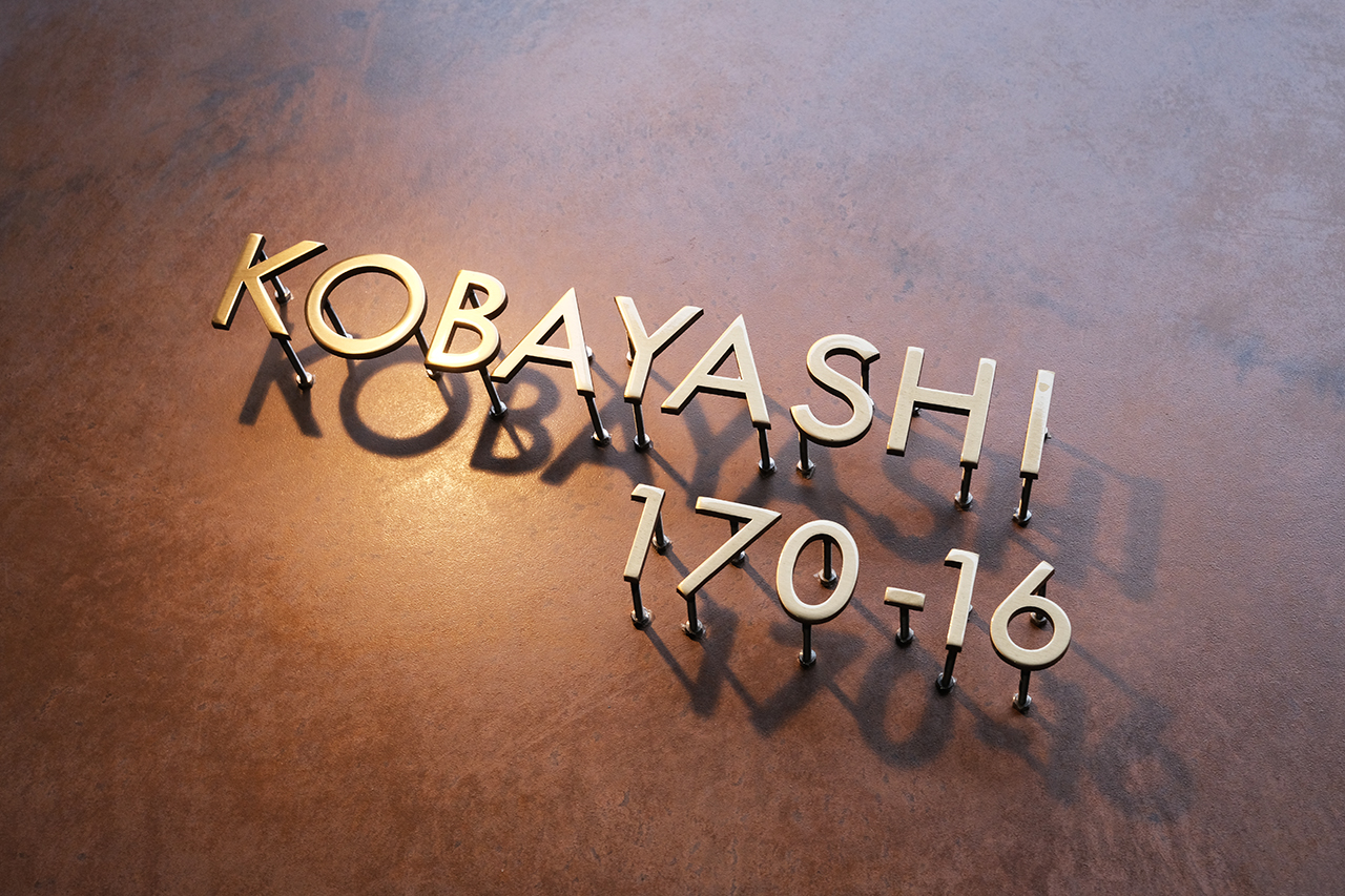 いぶし仕上げの真鍮切り文字表札と番地プレート