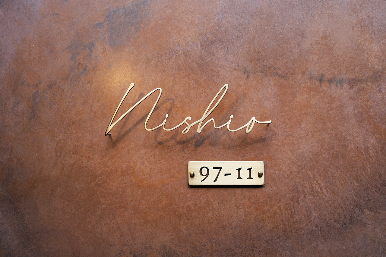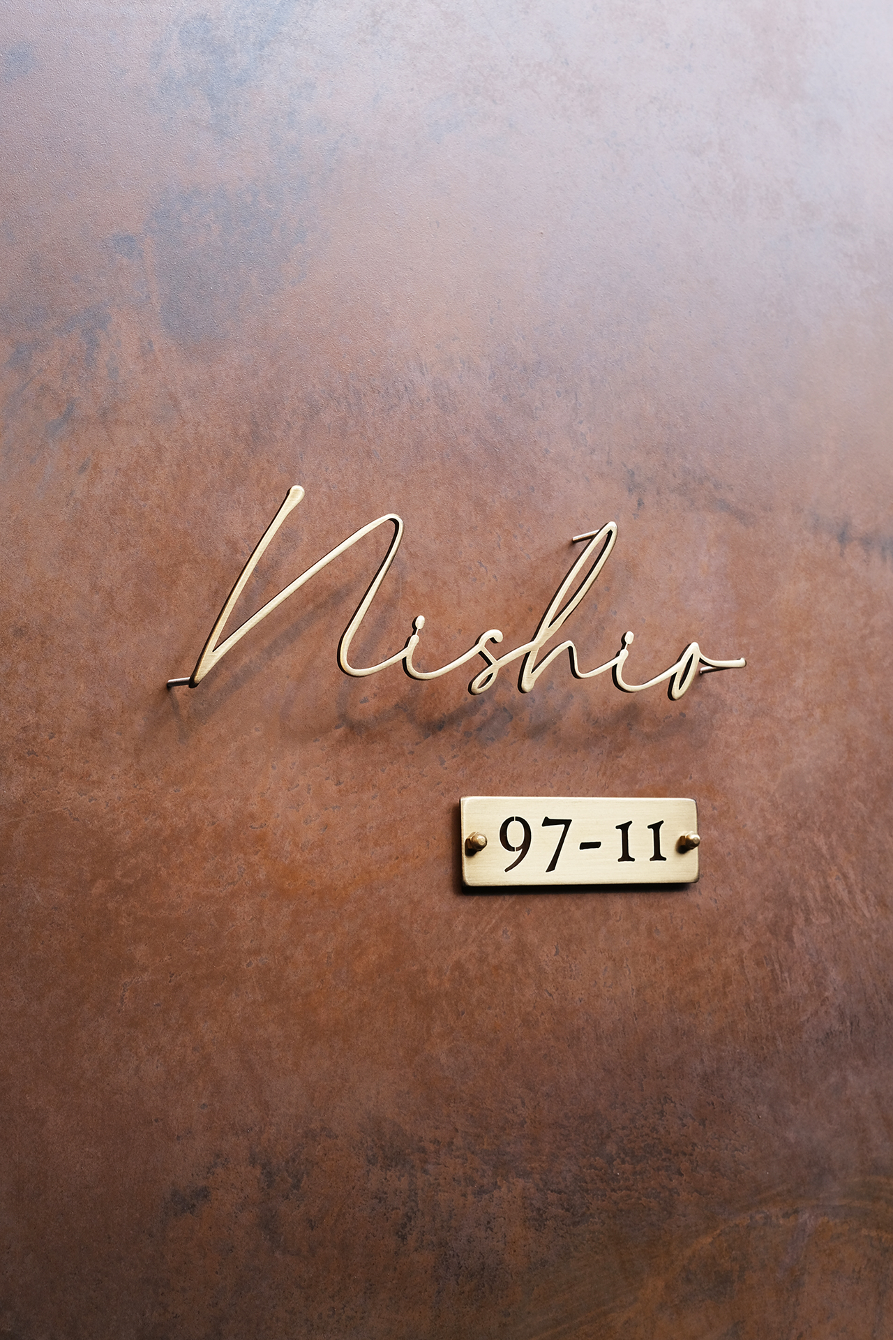 いぶし仕上げの真鍮切り文字表札と番地プレート