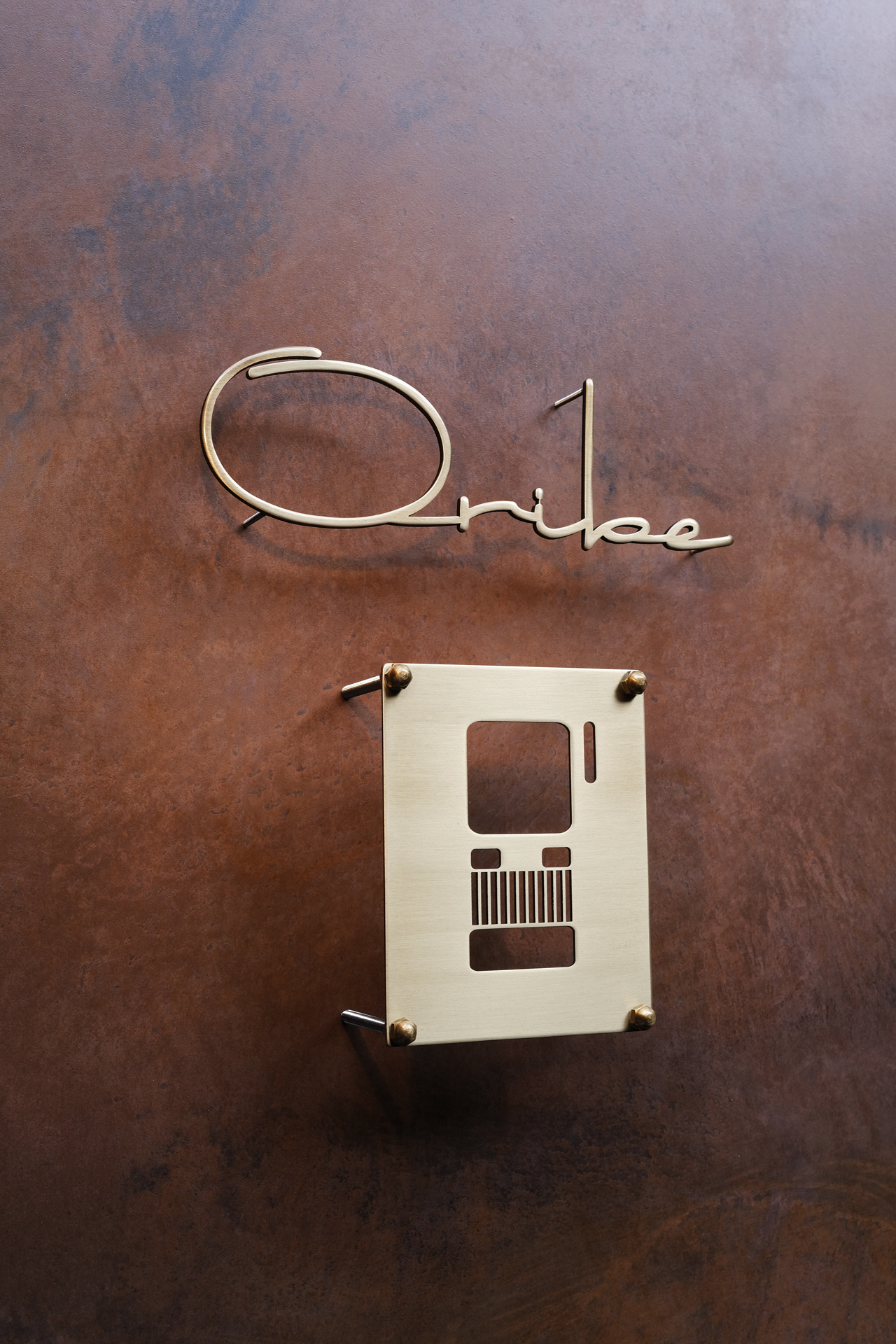 いぶし仕上げの真鍮切り文字表札と真鍮インターホンカバー