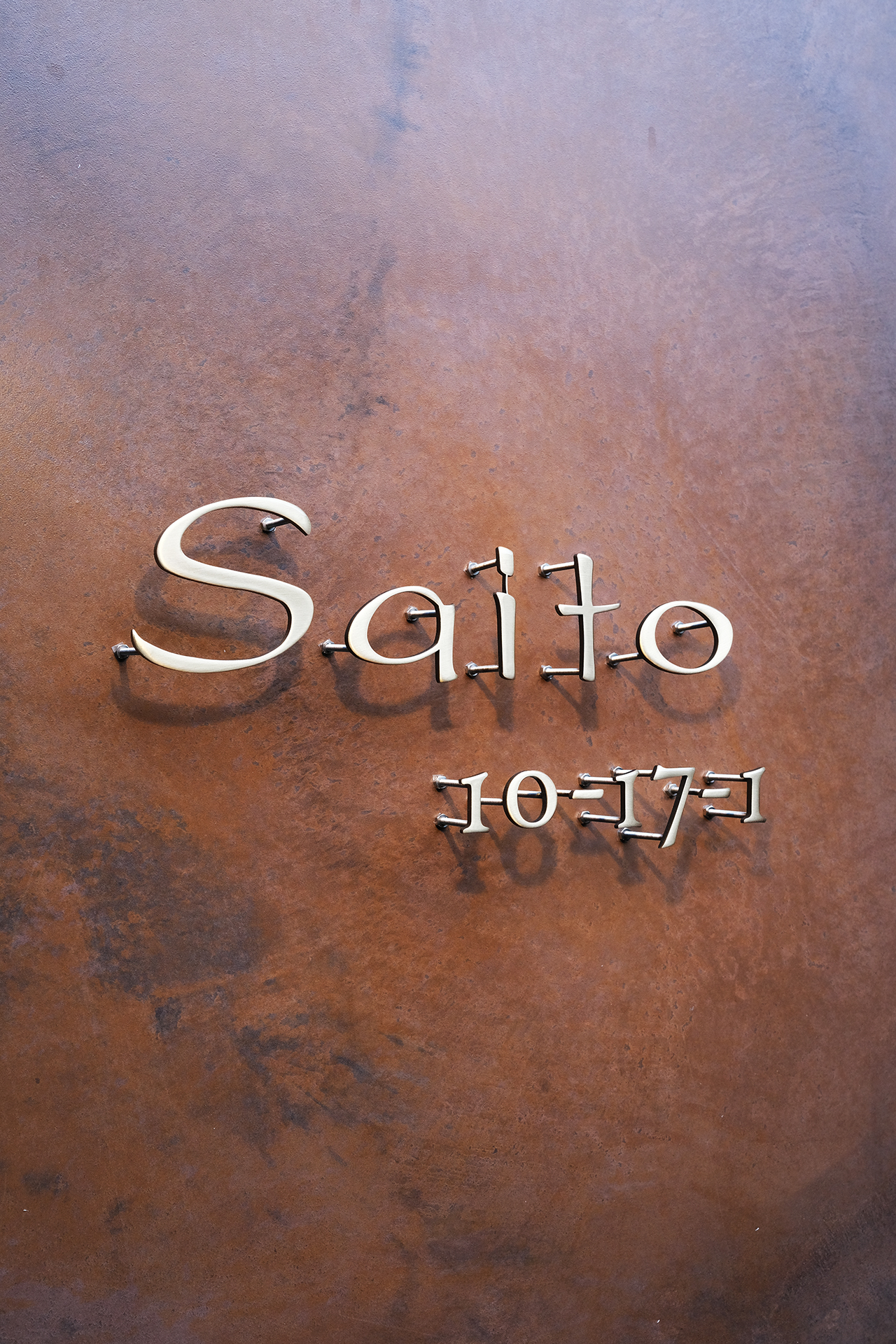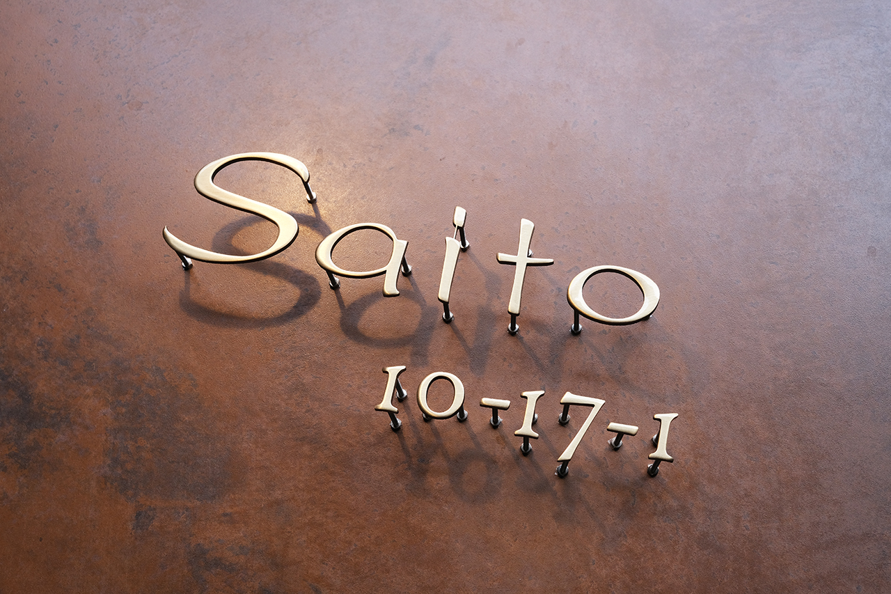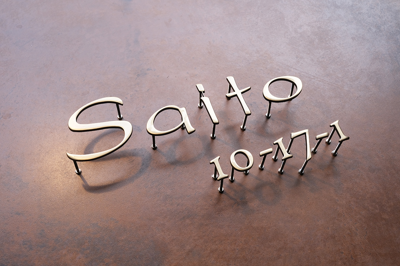 いぶし仕上げの真鍮切り文字表札とハウスナンバー