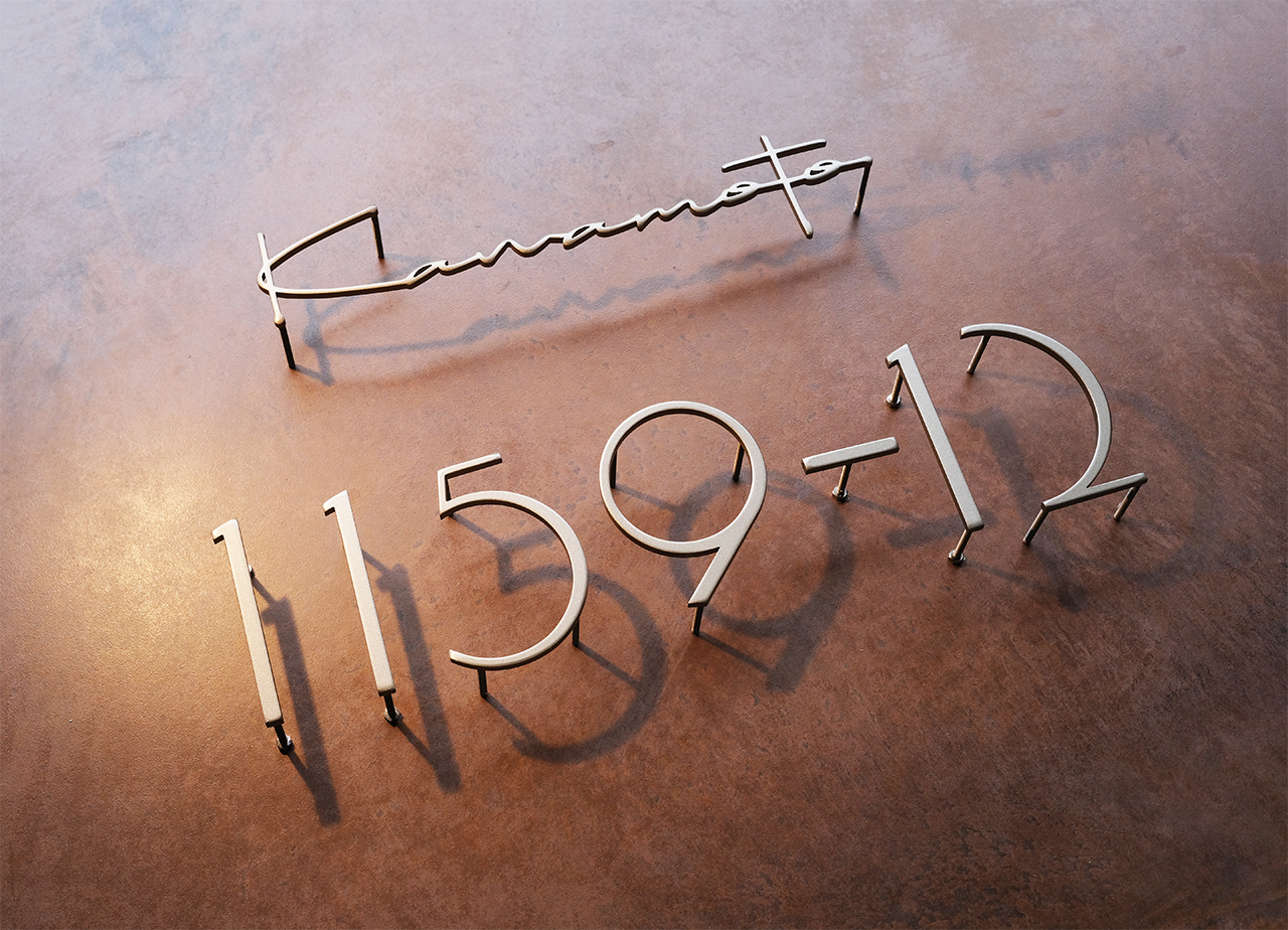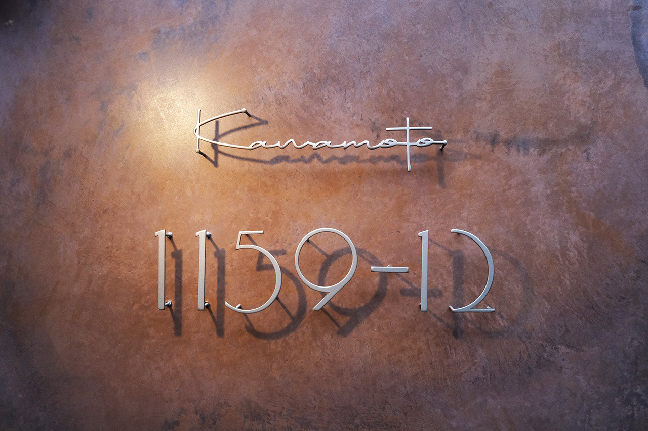マットゴールド焼付塗装のステンレス切り文字表札とハウスナンバー