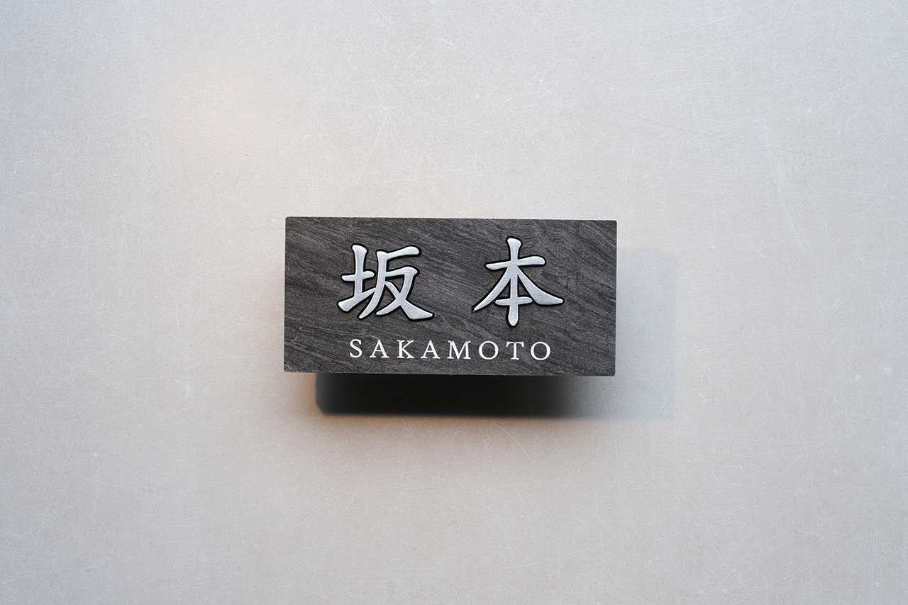 表情のあるブラックタイルと金属のコントラストが美しい表札です