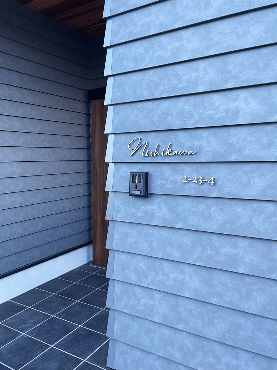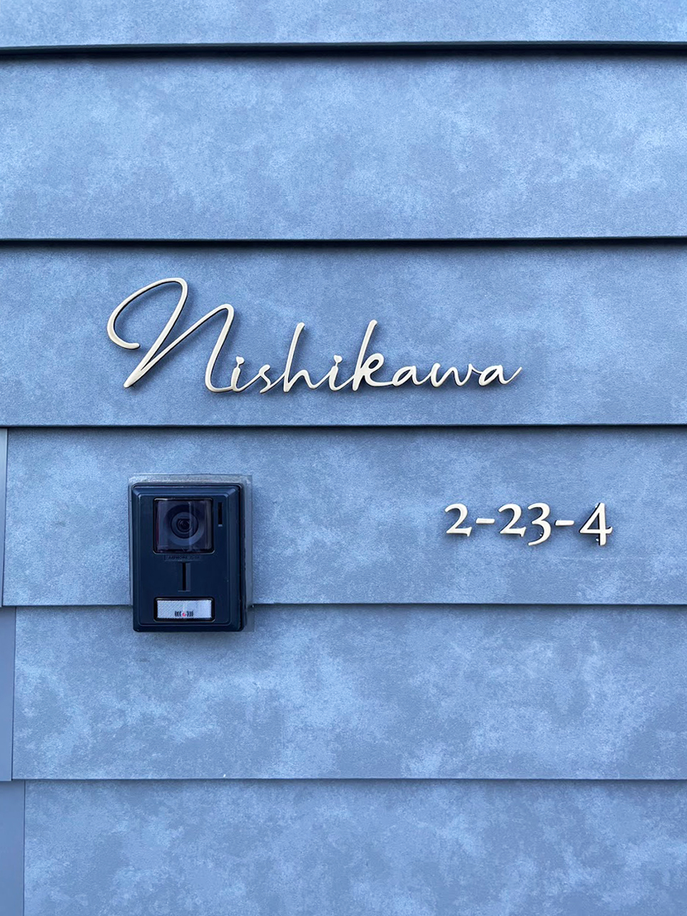 お気に入りの真鍮デザインから住居表示までの設置には現地にて立会いのもとサイデングのサイズ感とインターフォンのバランスを考慮し設置致しました。