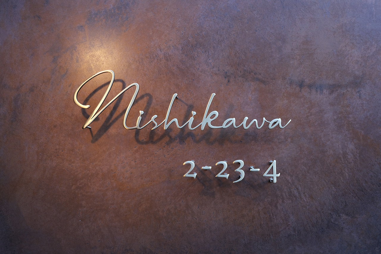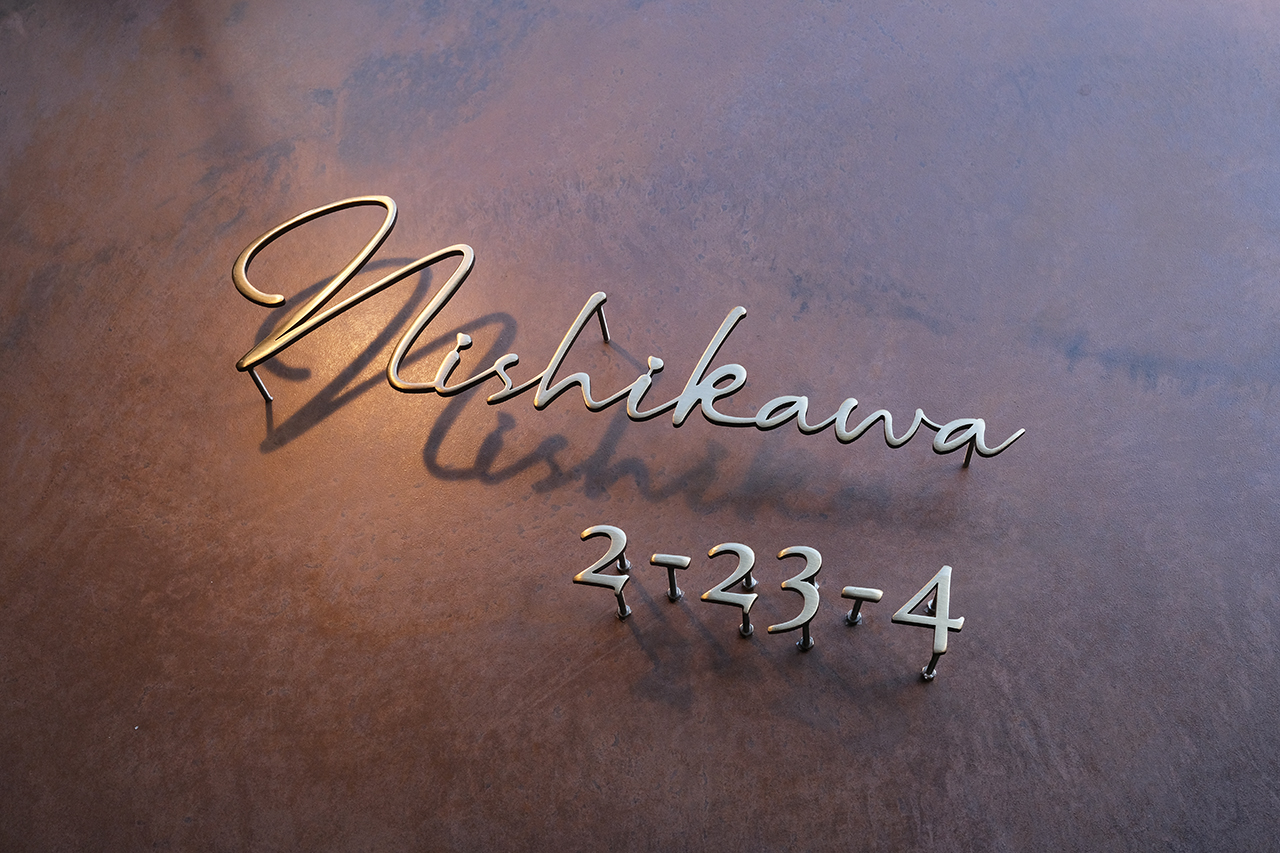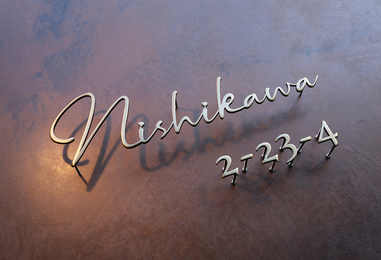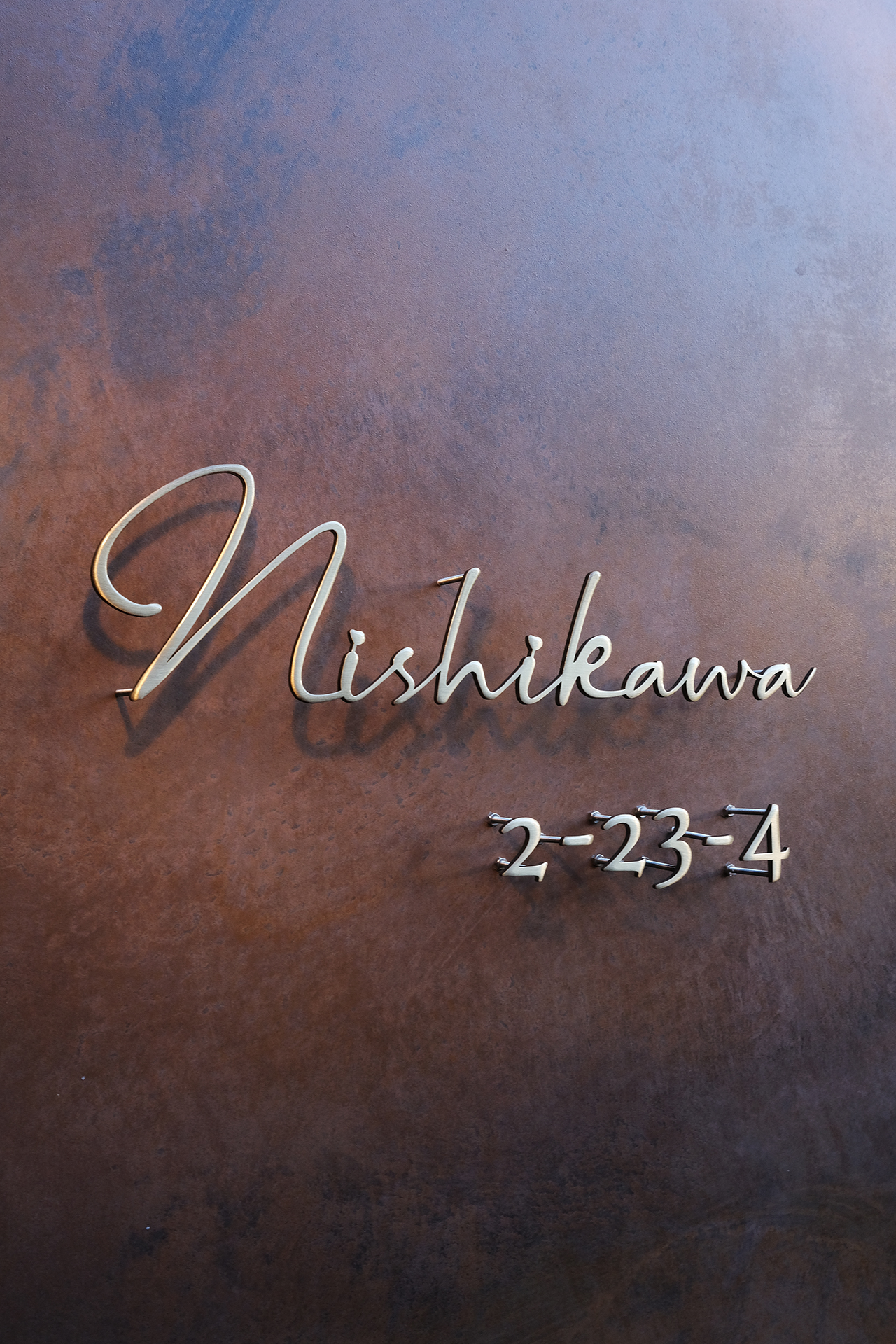いぶし仕上げの真鍮切り文字表札とハウスナンバー