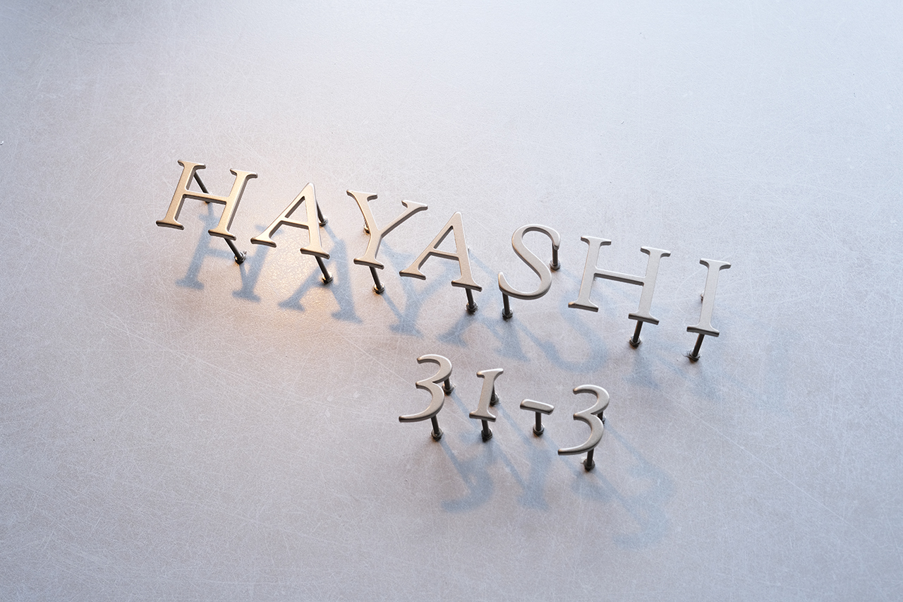 マットゴールドのステンレス切り文字表札とハウスナンバー