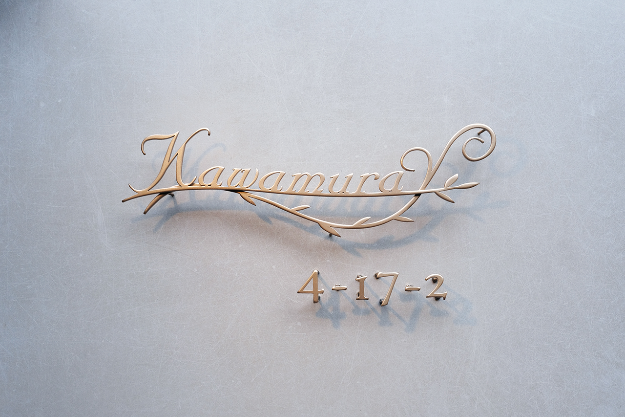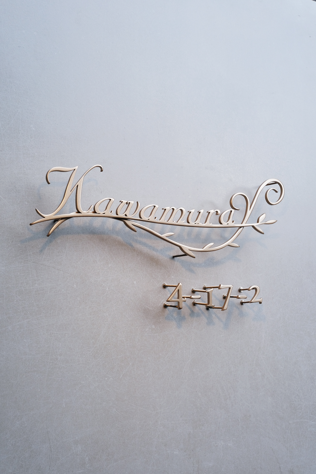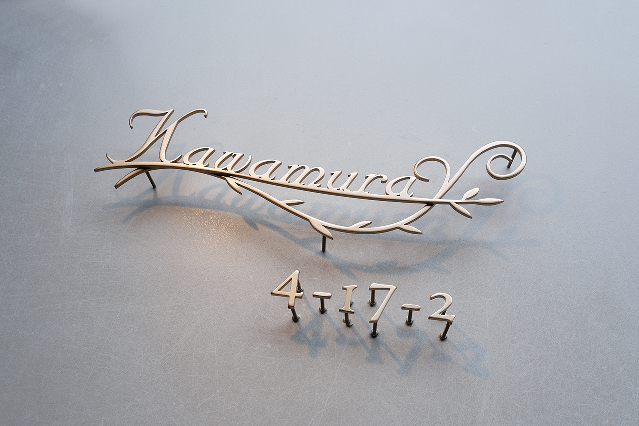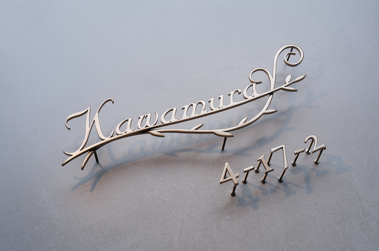ステンレスのリーフと表札を溶接して研磨、ゴールドの焼付塗装で仕上げました
