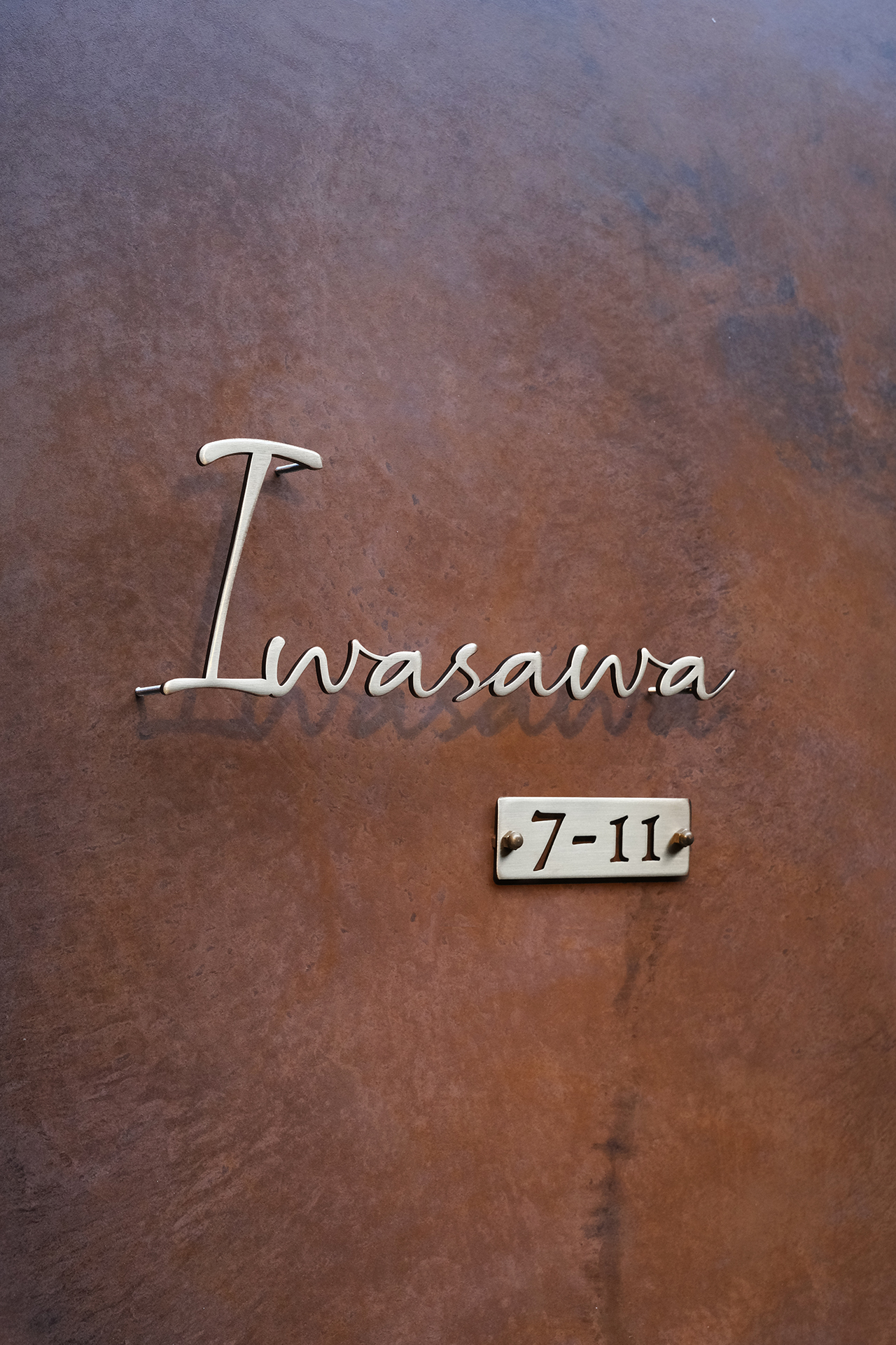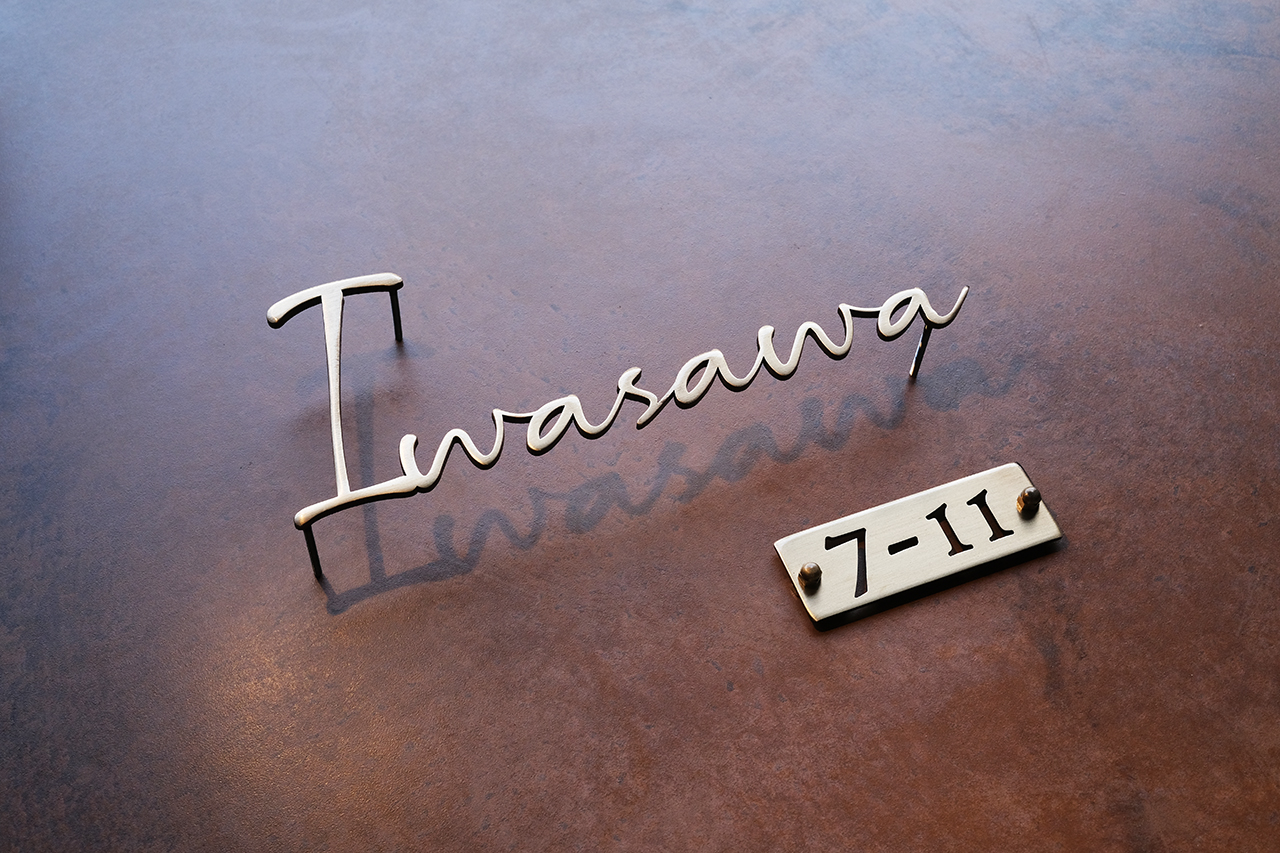 いぶし仕上げの真鍮切り文字表札と番地プレート