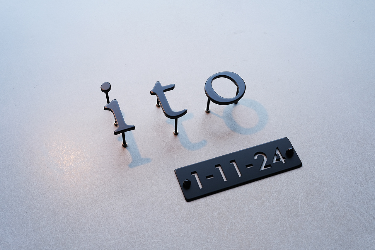 玄関の写真を拝見してご提案しました 表札幅 160mm 番地プレート 140x40mm