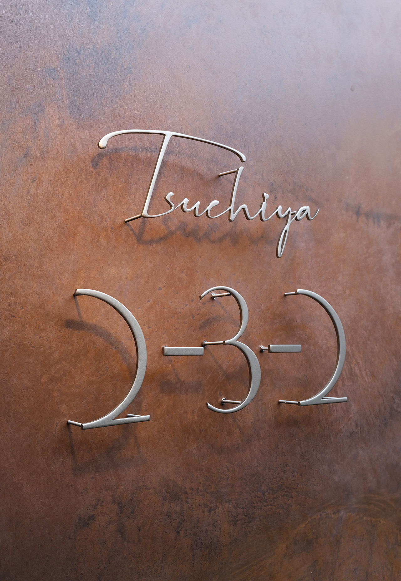 マットゴールド焼付塗装のステンレス切り文字表札とハウスナンバー