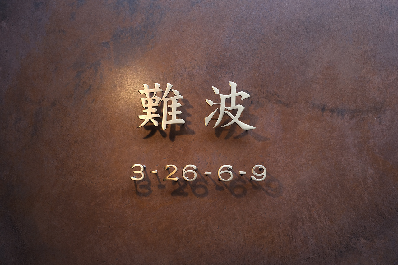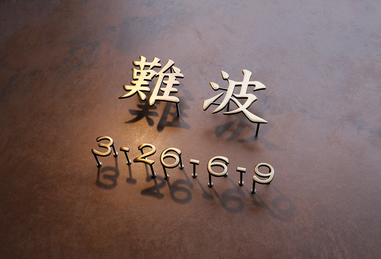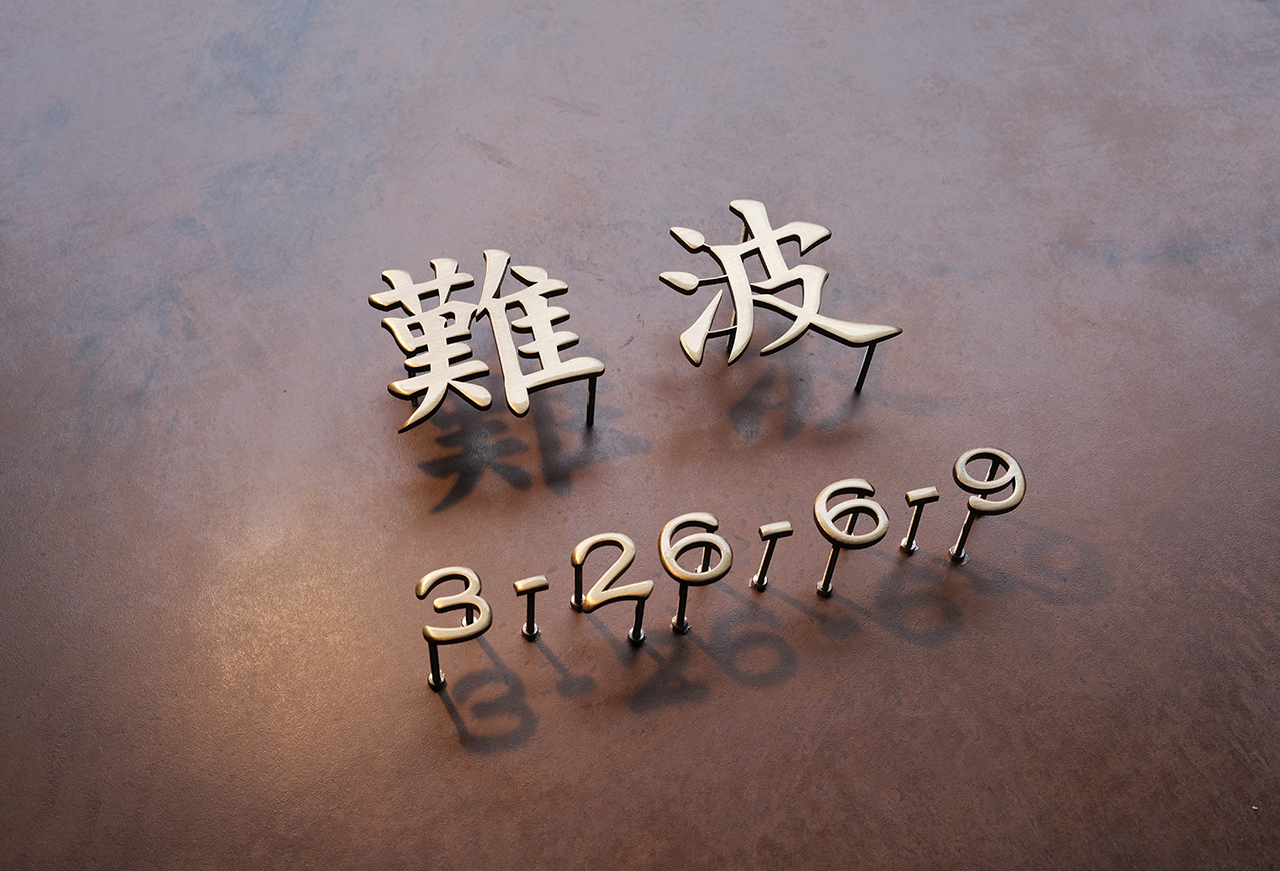 いぶし仕上げの真鍮切り文字表札とハウスナンバー