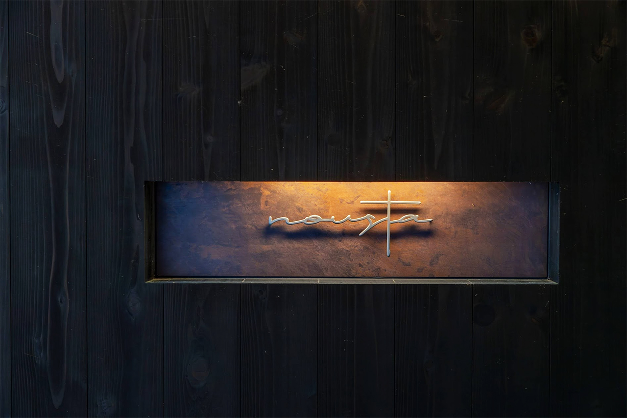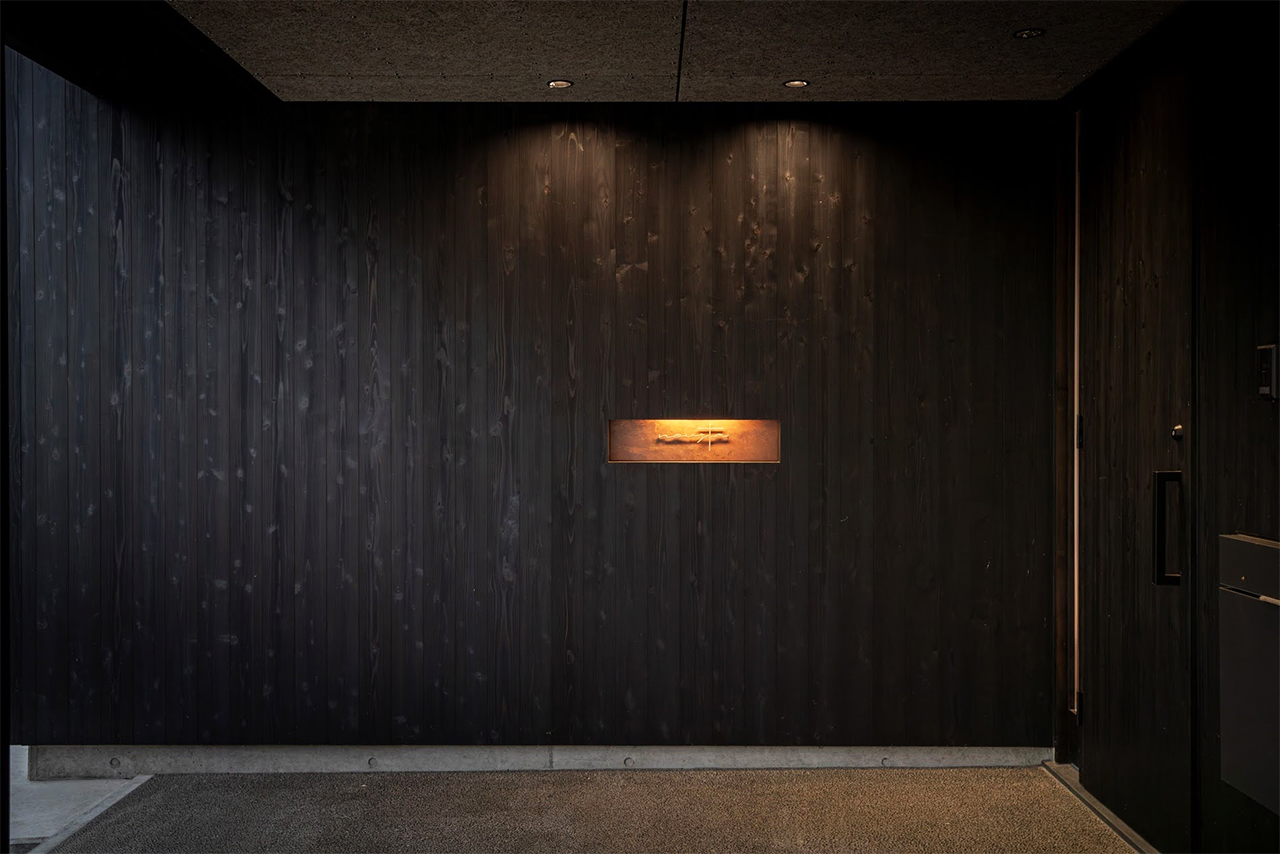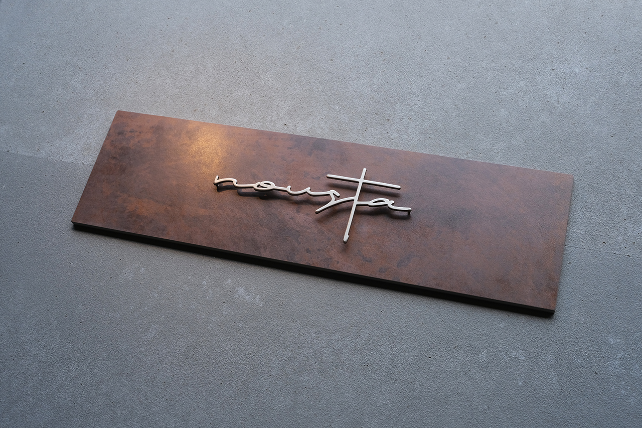 文字はいぶし仕上げの真鍮切り文字を浮かせて固定しています