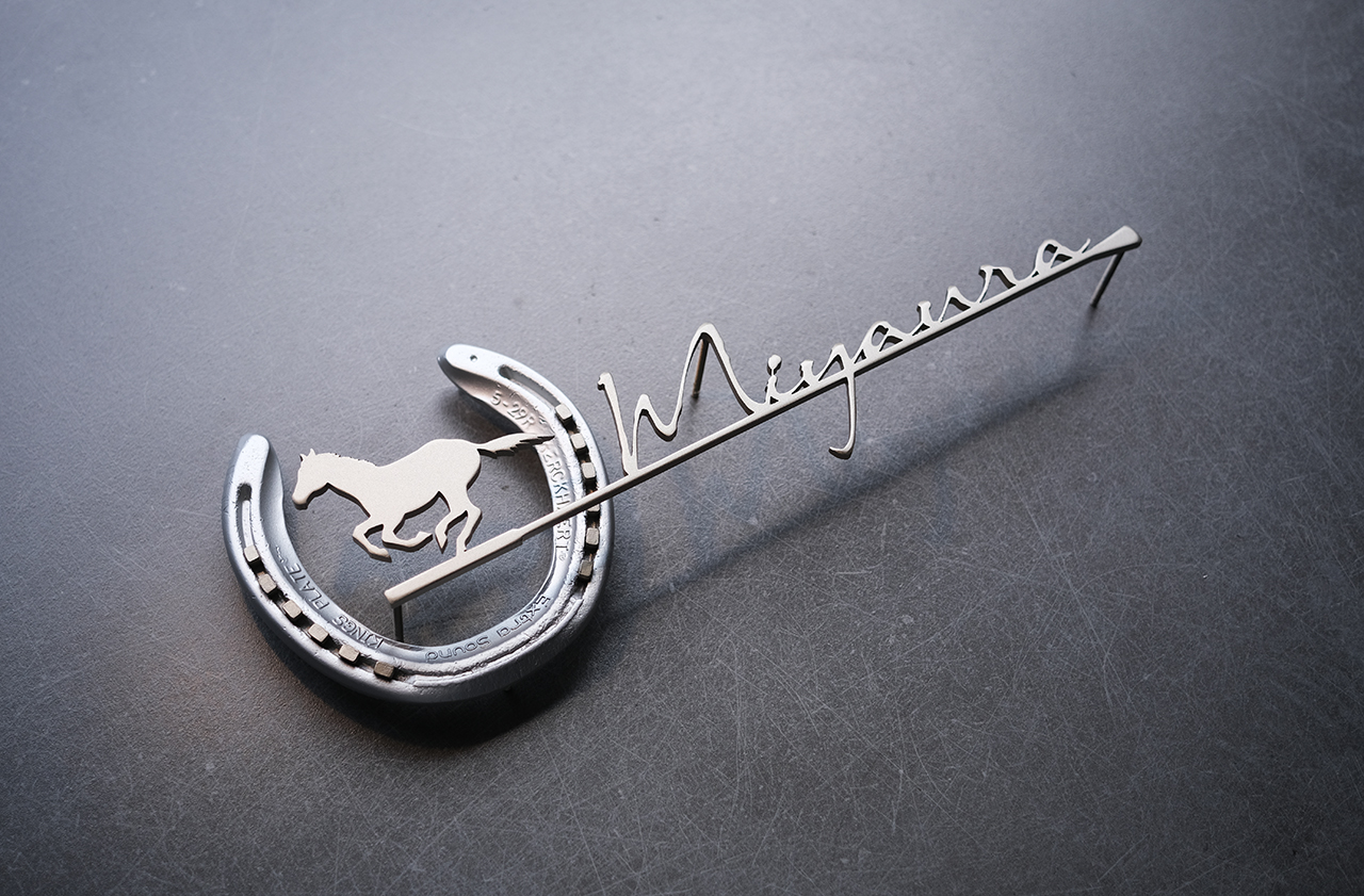 所有されている競走馬が使っていた蹄鉄を使って製作した創作表札