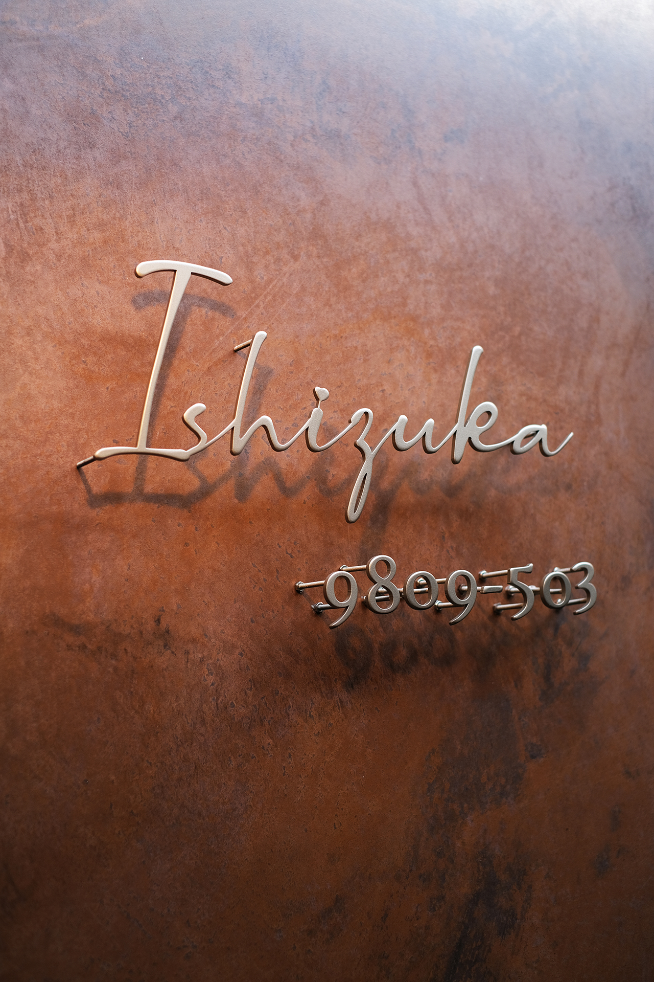 マットゴールドのステンレス切り文字表札とハウスナンバー