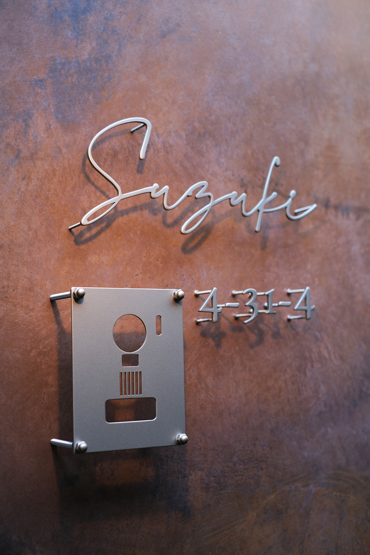 マットゴールド仕上げのステンレス切り文字表札ハウスナンバーとインターホンカバー
