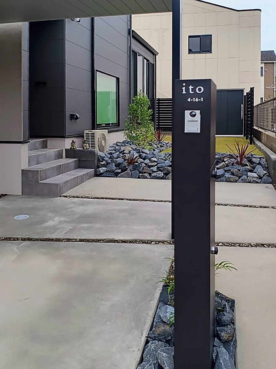 機能門柱用のステンレス切り文字表札とハウスナンバー