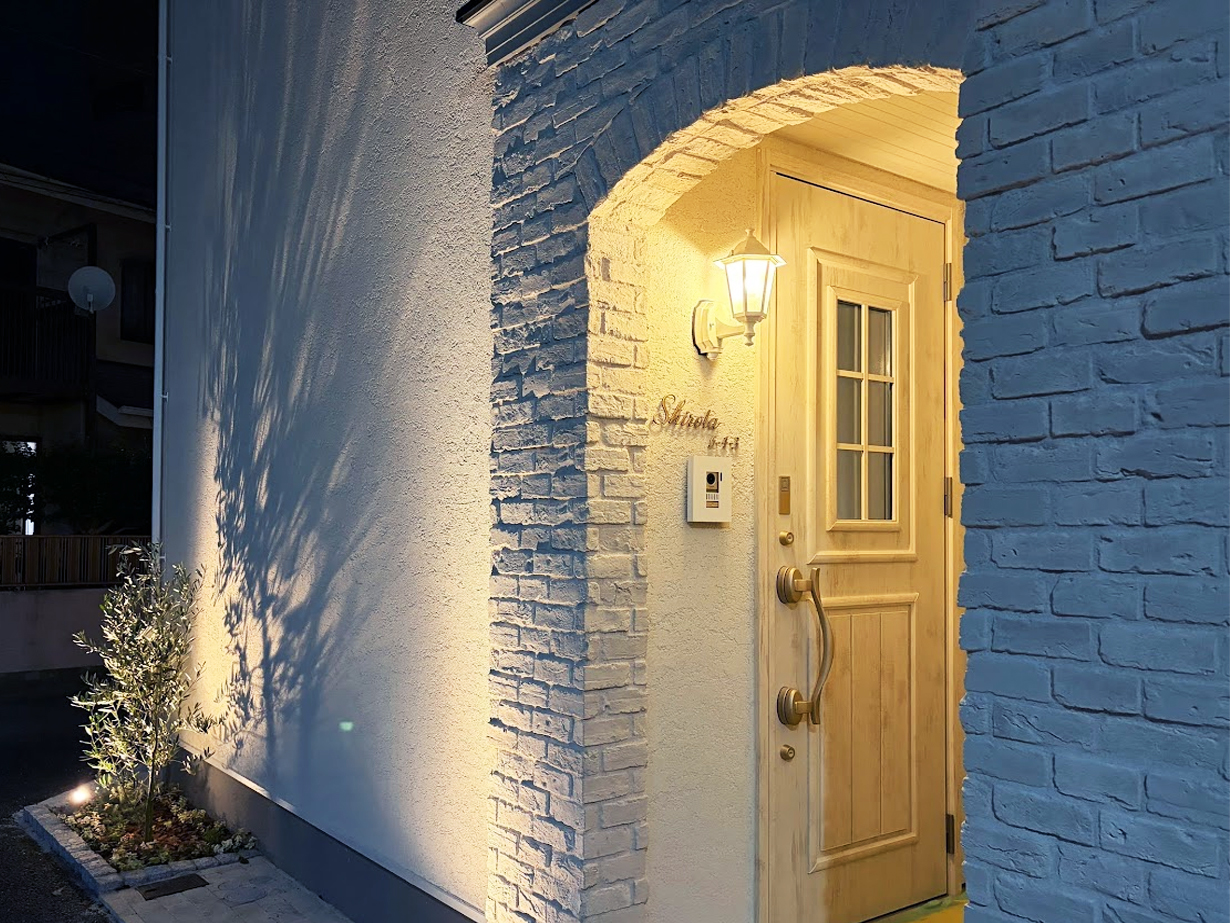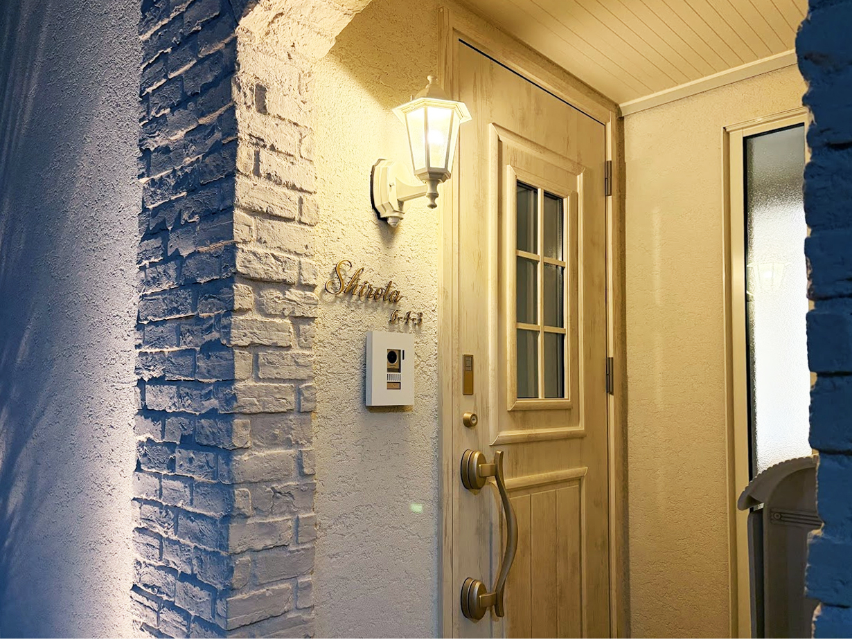いぶし仕上げの真鍮切り文字表札とハウスナンバー