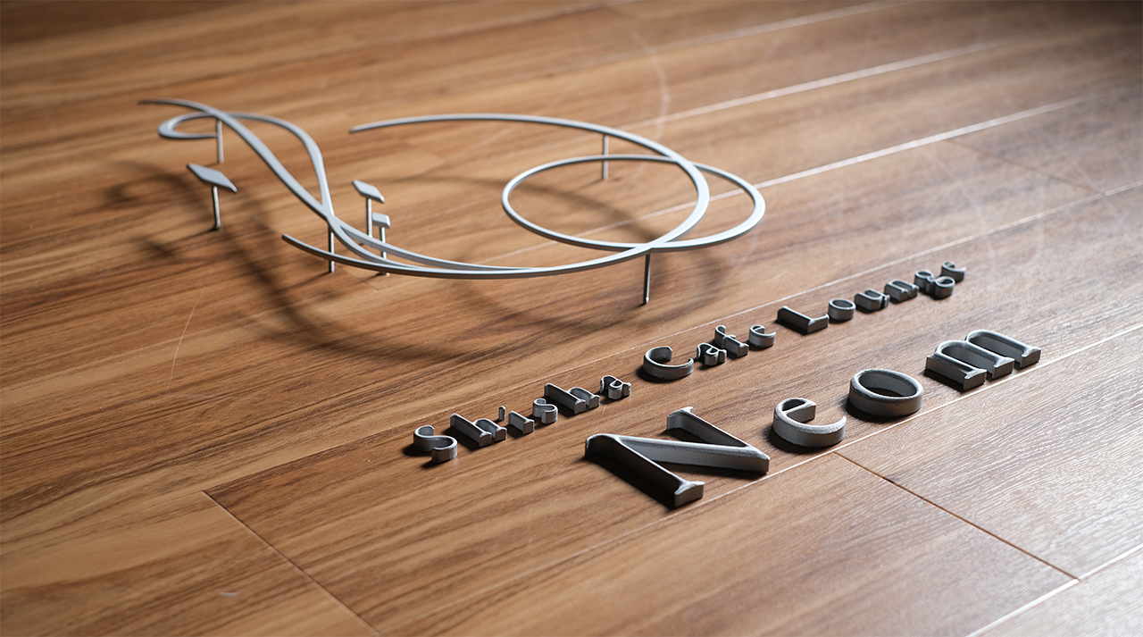 ご希望をお聞きしてロゴはステンレス切り文字、文字は3Dプリント(カーボンファイバー)