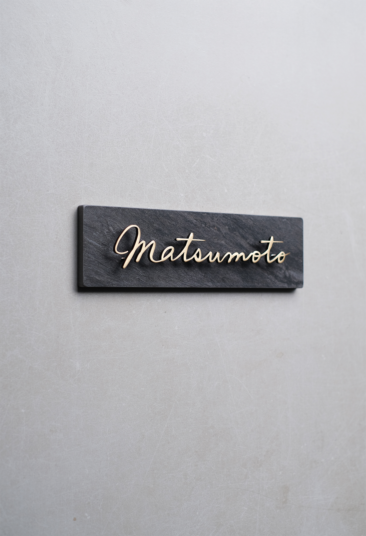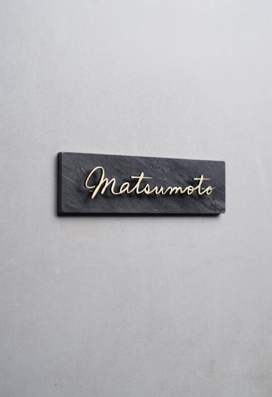 表情のあるタイルにいぶし仕上げの真鍮切り文字を浮かせて固定