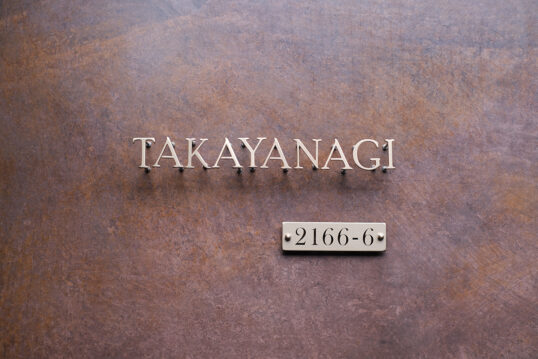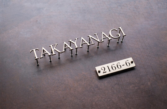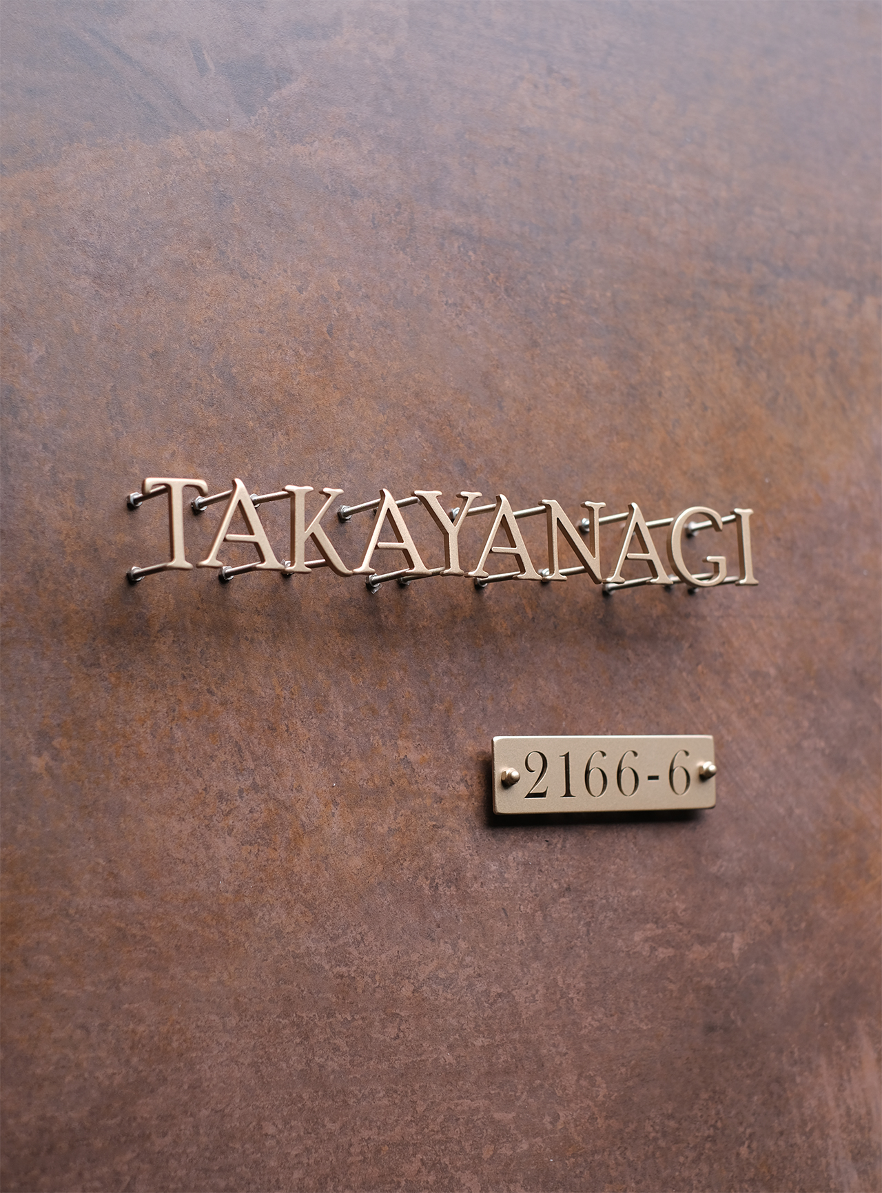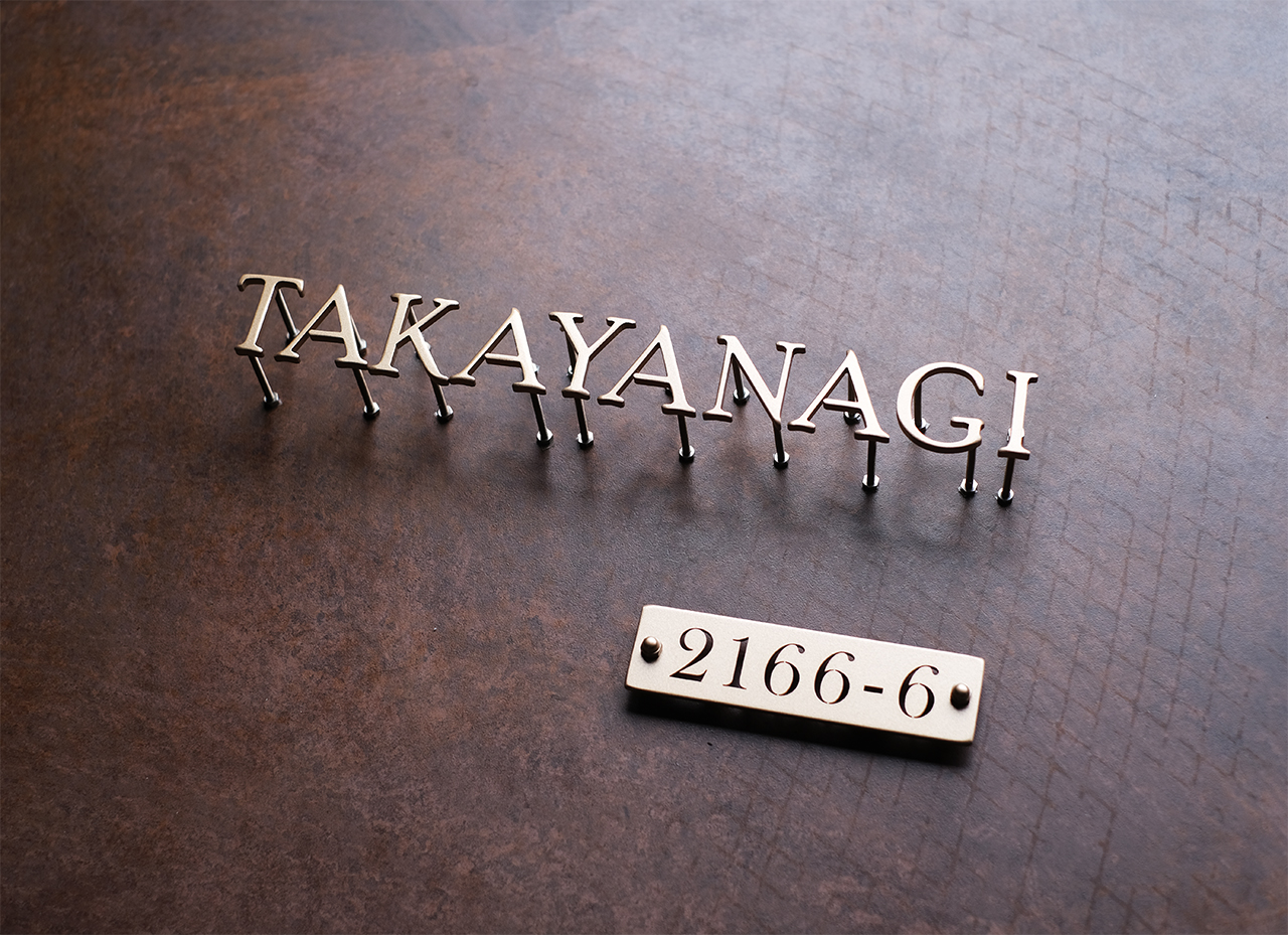 ゴールドの焼付塗装のステンレス切り文字表札と番地プレート